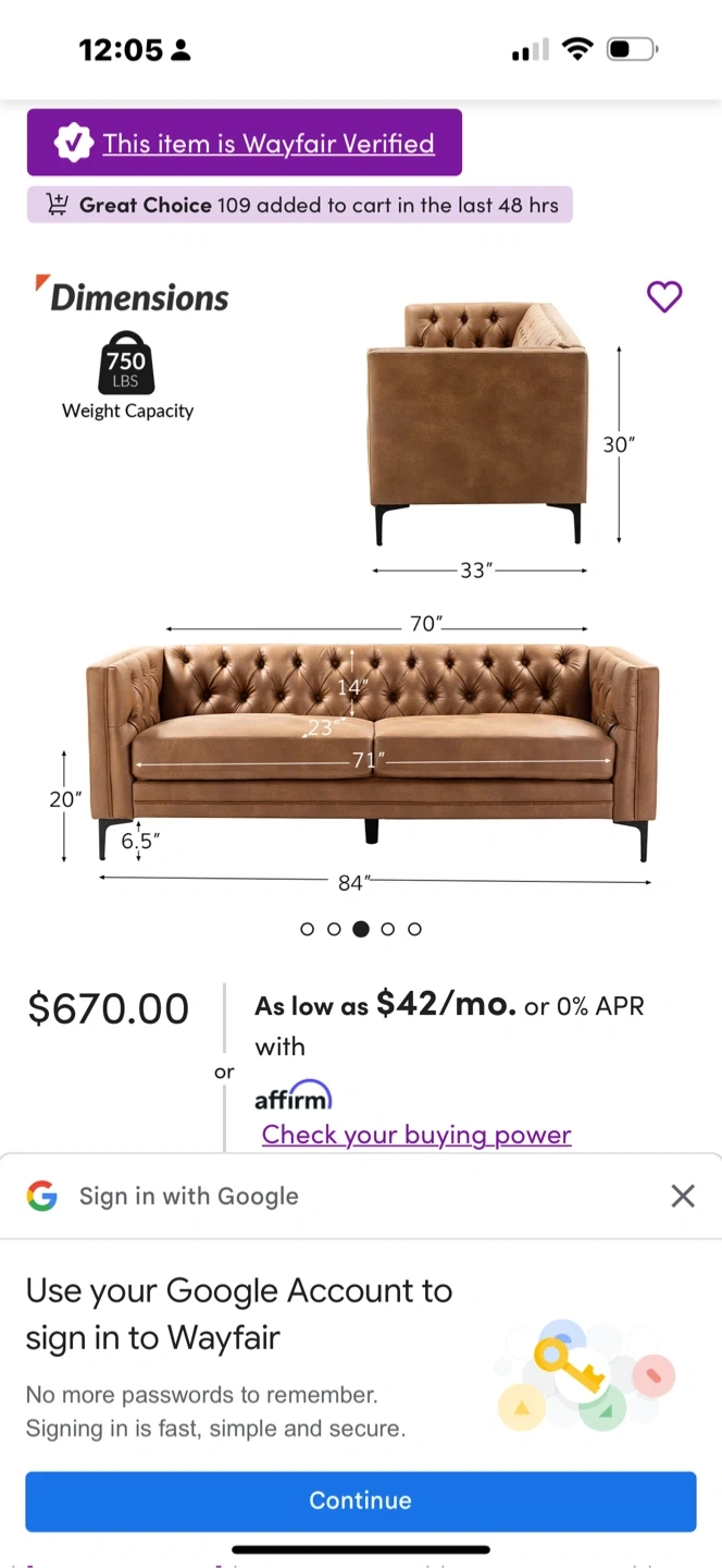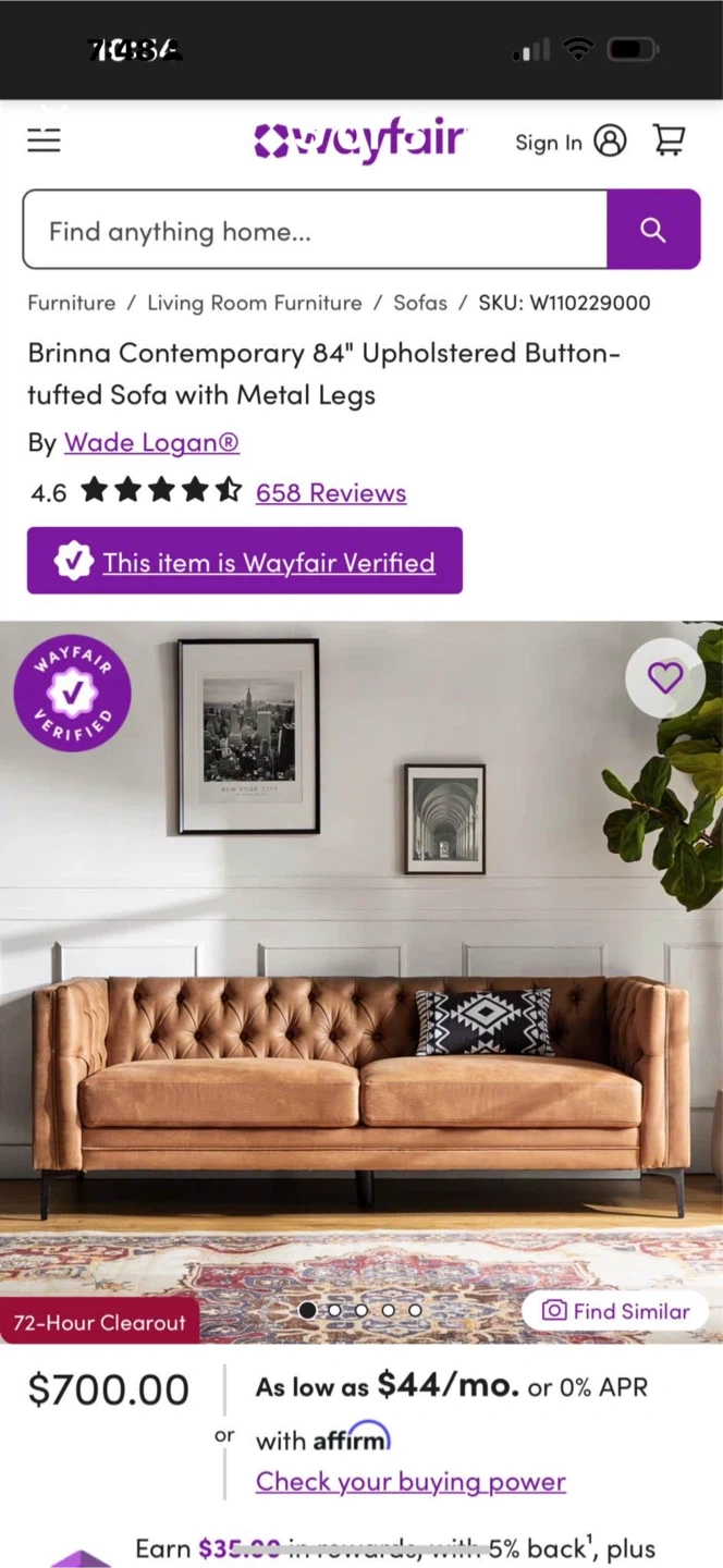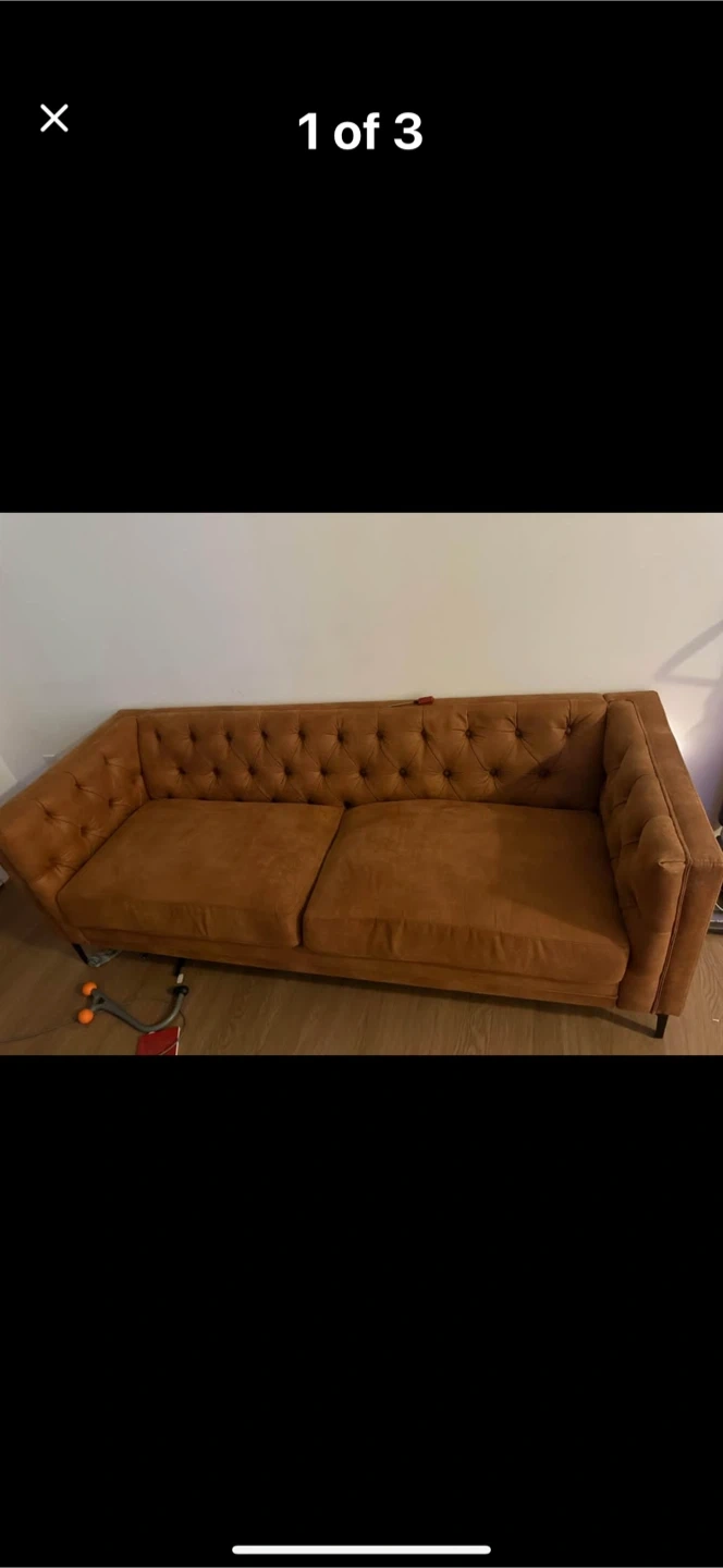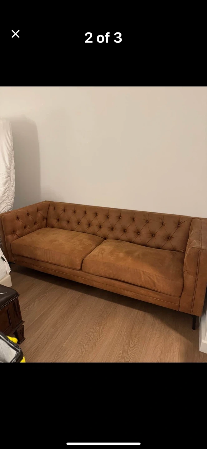 10Selling a Wade Logan Brinna contemporary 84" upholstered button-tufted sofa with metal legs. It's a beautiful brown color and in great condition. The dimensions are: 30" height, 84" width, and 33" depth.