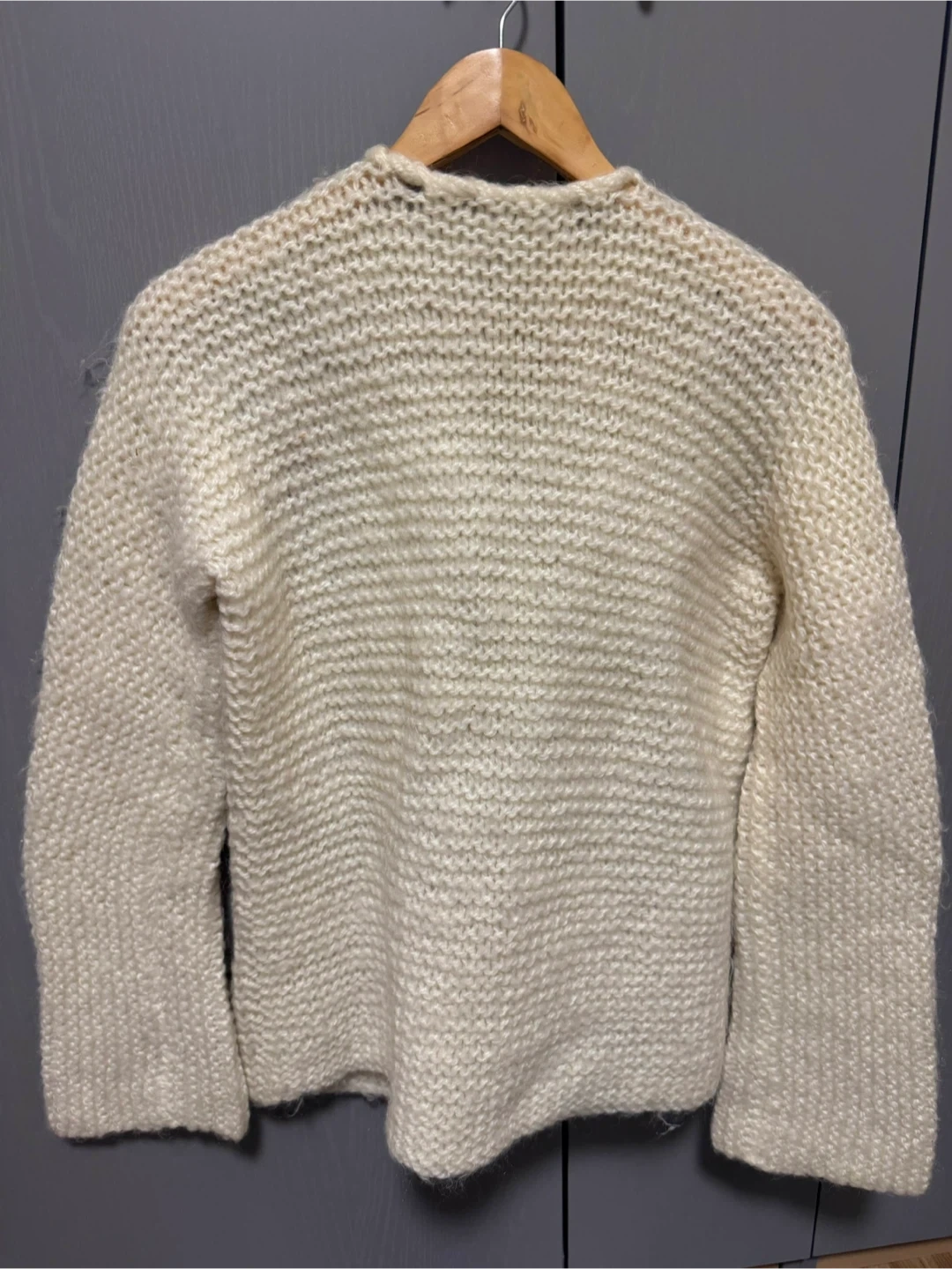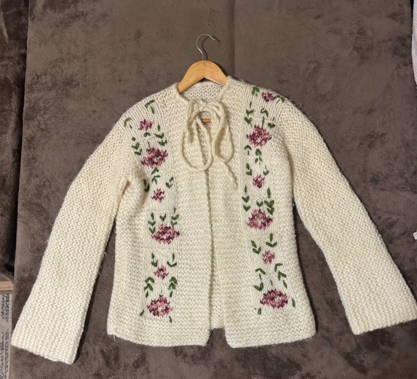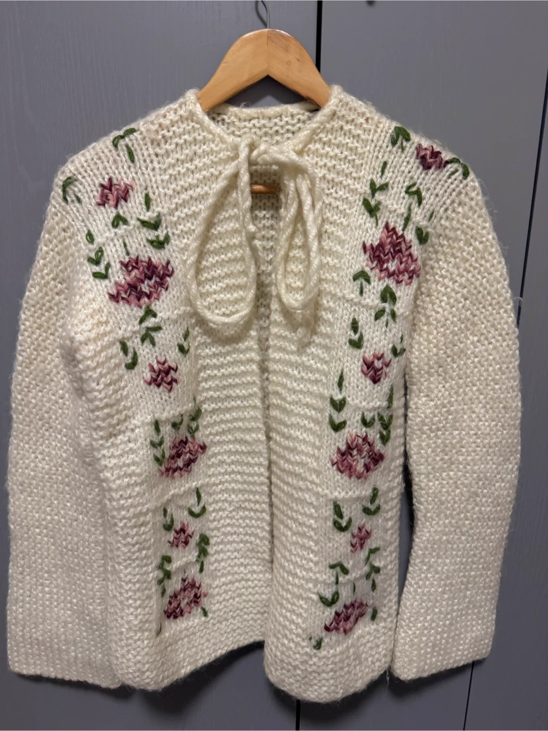 Here's a lovely hand-knitted cream wool cardigan! It features beautiful floral embroidery and a tie closure. Perfect for adding a cozy and unique touch to any outfit! The material is soft and warm, great for layering during cooler weather