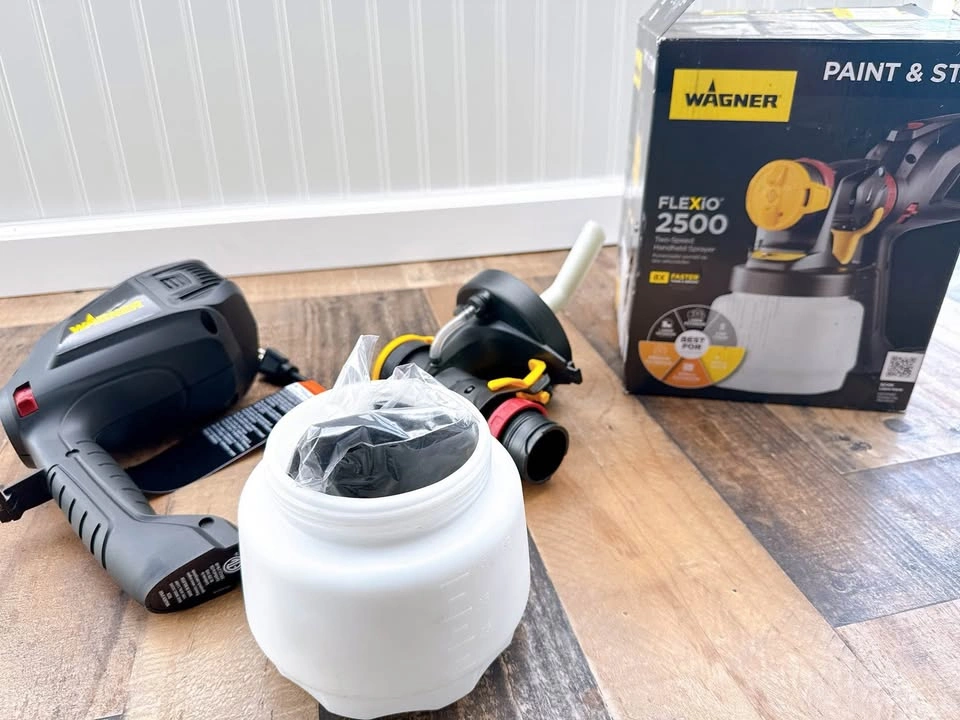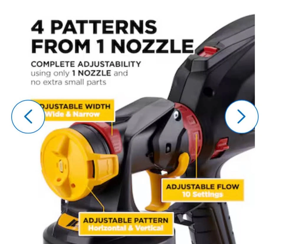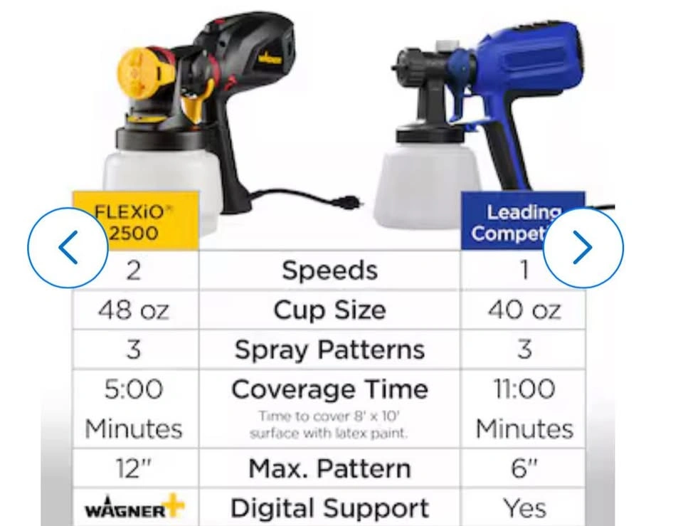 The Wagner FLEXiO 2500 paint sprayer applies a smooth, consistent finish on a wide range of interior and exterior painting projects such as walls, ceilings, fences, decks and more. It sprays 8X faster than a brush to get projects done quickly and delivers the power to spray unthinned paints and stains right from the can, including paints and primers, solid stains, sealers and more. The sprayer features a compact, lightweight design that greatly reduces user fatigue and makes it easier to carry when spraying. It also features multiple adjustable settings including an adjustable spray width, material flow control and spray pattern. Plus, the two speed turbine allows you to turn to high for thick materials and low for thin materials. The sprayer comes with cup liners and features few parts that separate and rinse clean for easy clean-up.