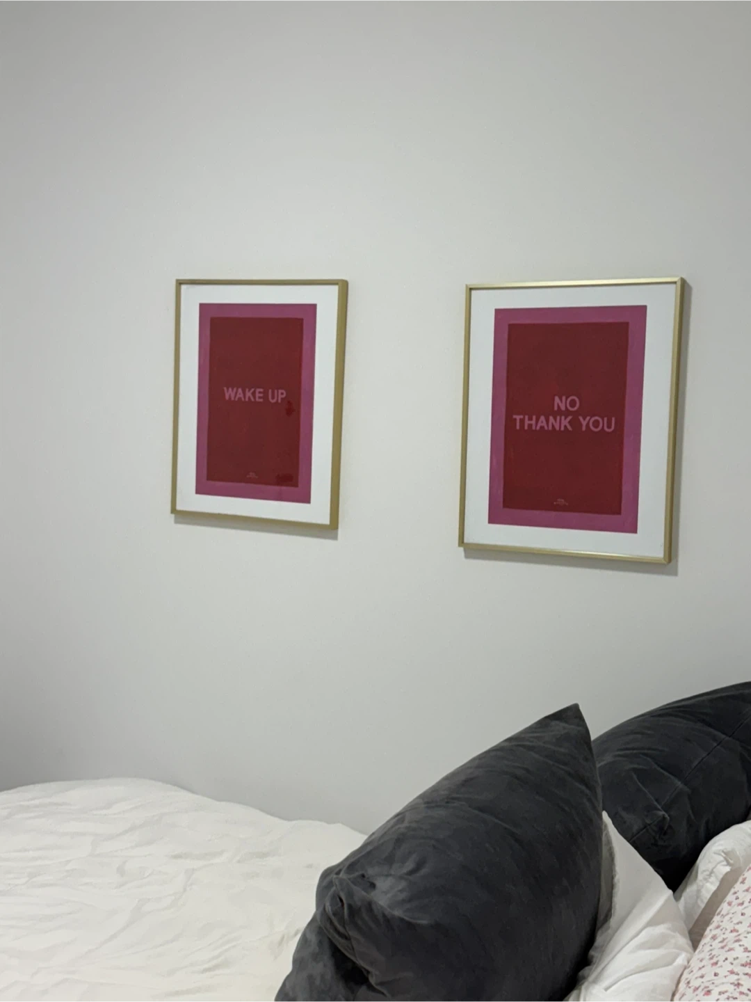 812 pink prints from Hotel Magique in gold frames ‘Wake Up’ ‘No Thank You’ (sold as a set) Frames are 16 x 20 Perfect for bedroom or dorm to hang above beds Pick up in fidi, cash or Venmo