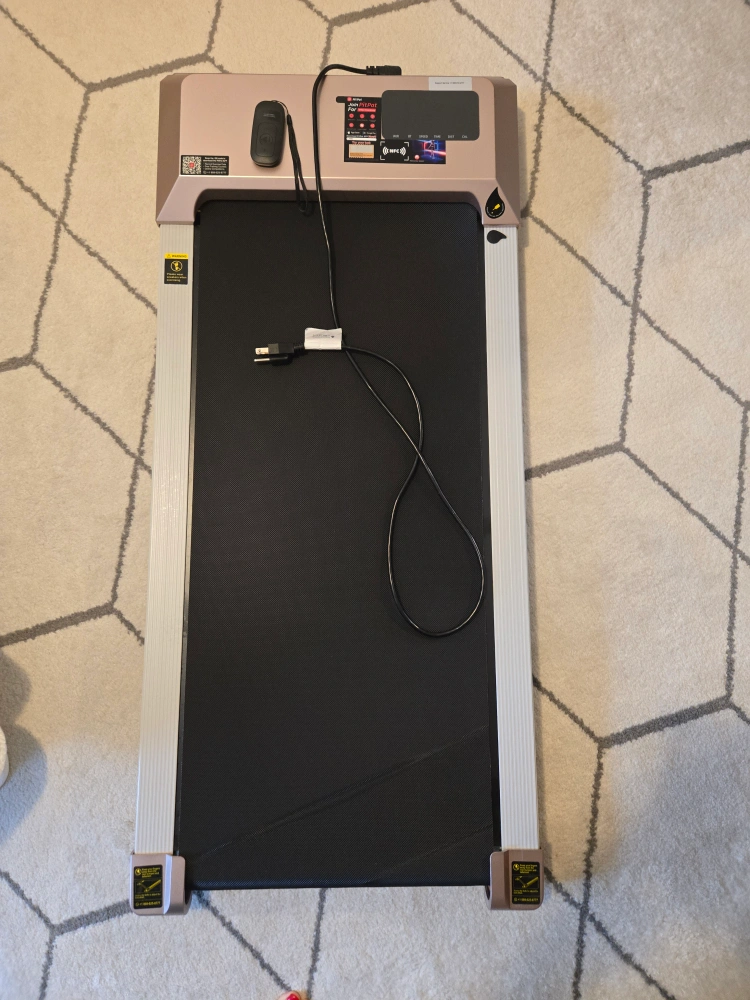 30The treadmill features a display screen and a remote control. It has a black running surface with a metallic frame. This is perfect for a quick walk while watching your favorite show.
