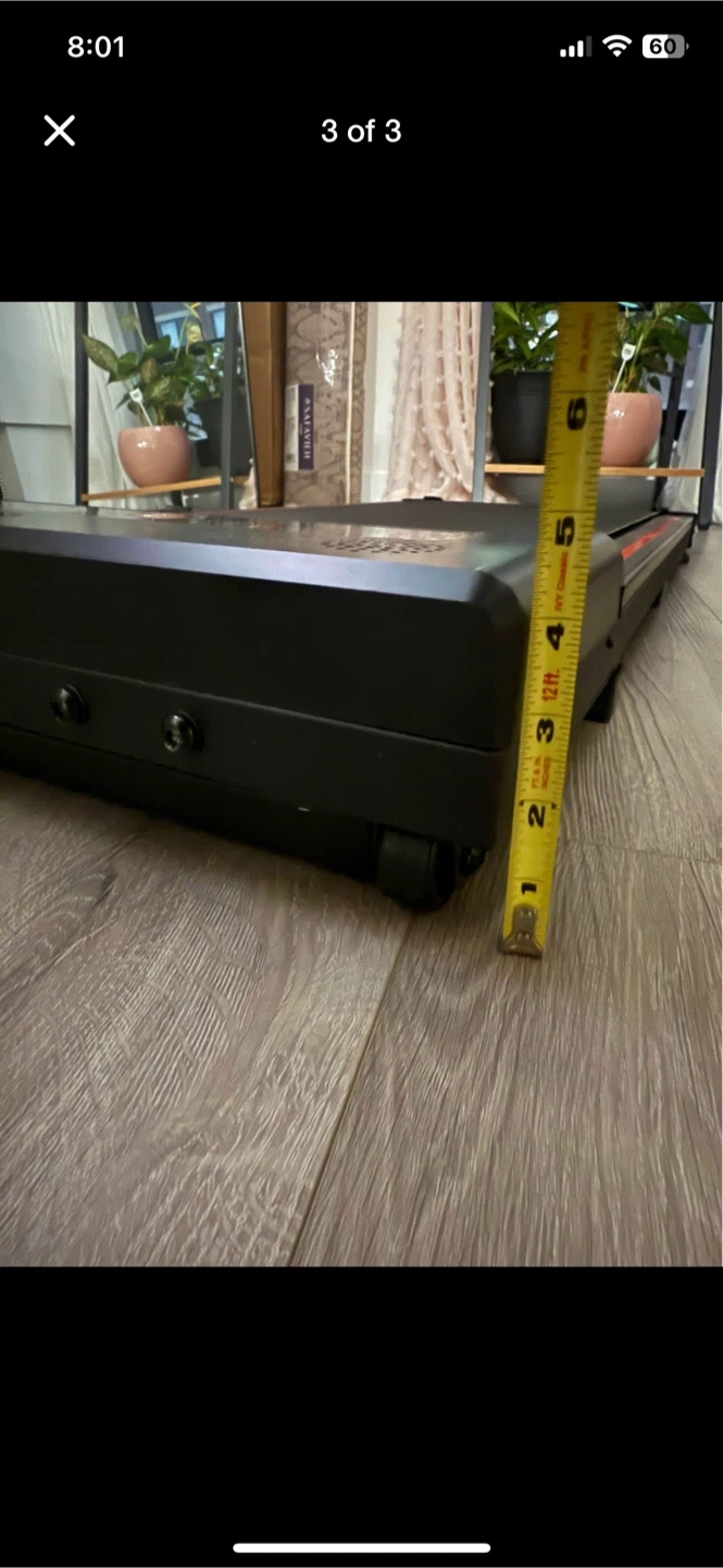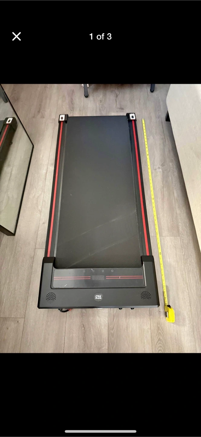 Selling walking pad , perfect for small spaces! It's black with red accents and has a compact design for easy storage. It also has wheels for easy portability