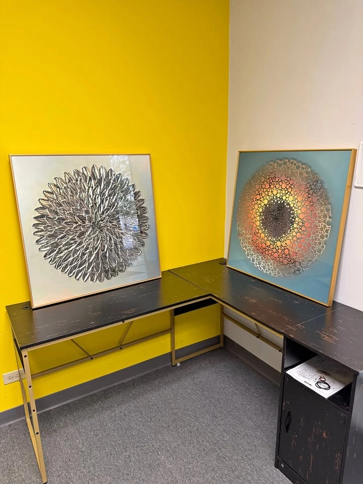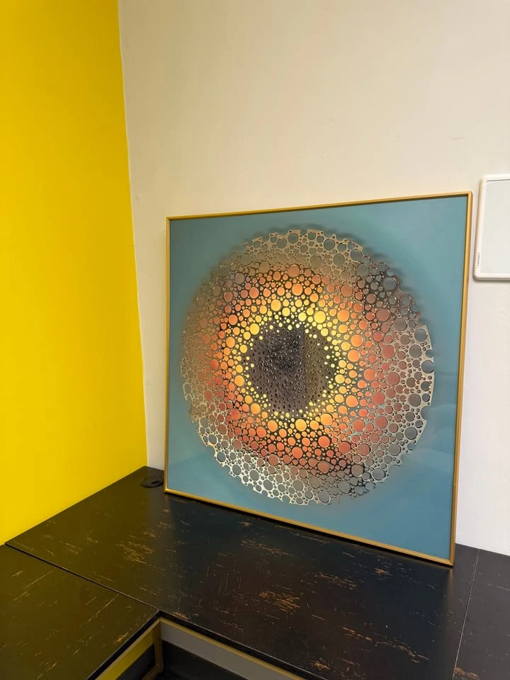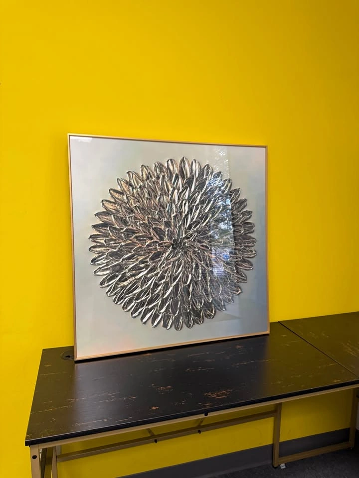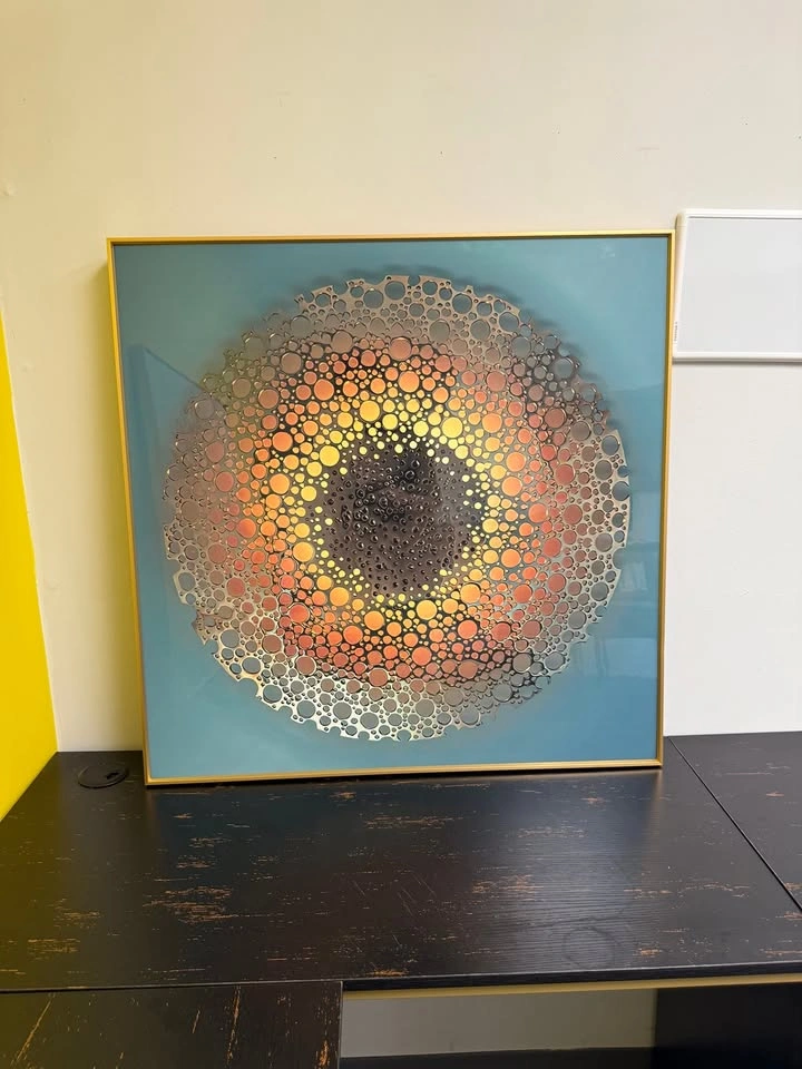 Add a bold statement piece to your space with this stunning 39x39 inch framed artwork. Featuring an intricate circular design with layered metallic cutouts over a gradient background of warm gold, orange, and deep tones, this piece radiates both modern elegance and artistic depth. Size: 39x39 inches (framed) Frame: Sleek gold trim for a contemporary finish Style: Modern / Geometric / Abstract Condition: Excellent, ready to hang Perfect for a living room, office, or creative space. This artwork adds sophistication and a touch of modern design to any interior. 💰 Asking Price each: 70$ 📍 Local pickup available 702 w algonquin rd