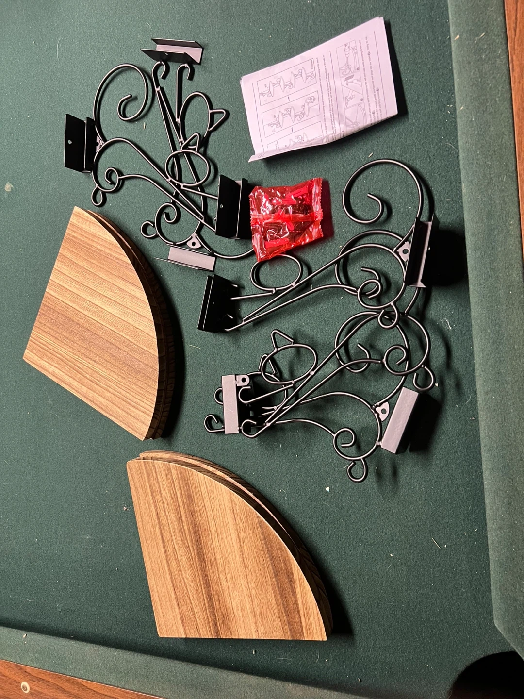 Selling a set of wall-mounted corner shelves! They have a nice wood grain finish and come with the mounting hardware and instructions. Perfect for adding a bit of storage and style to any corner of your home