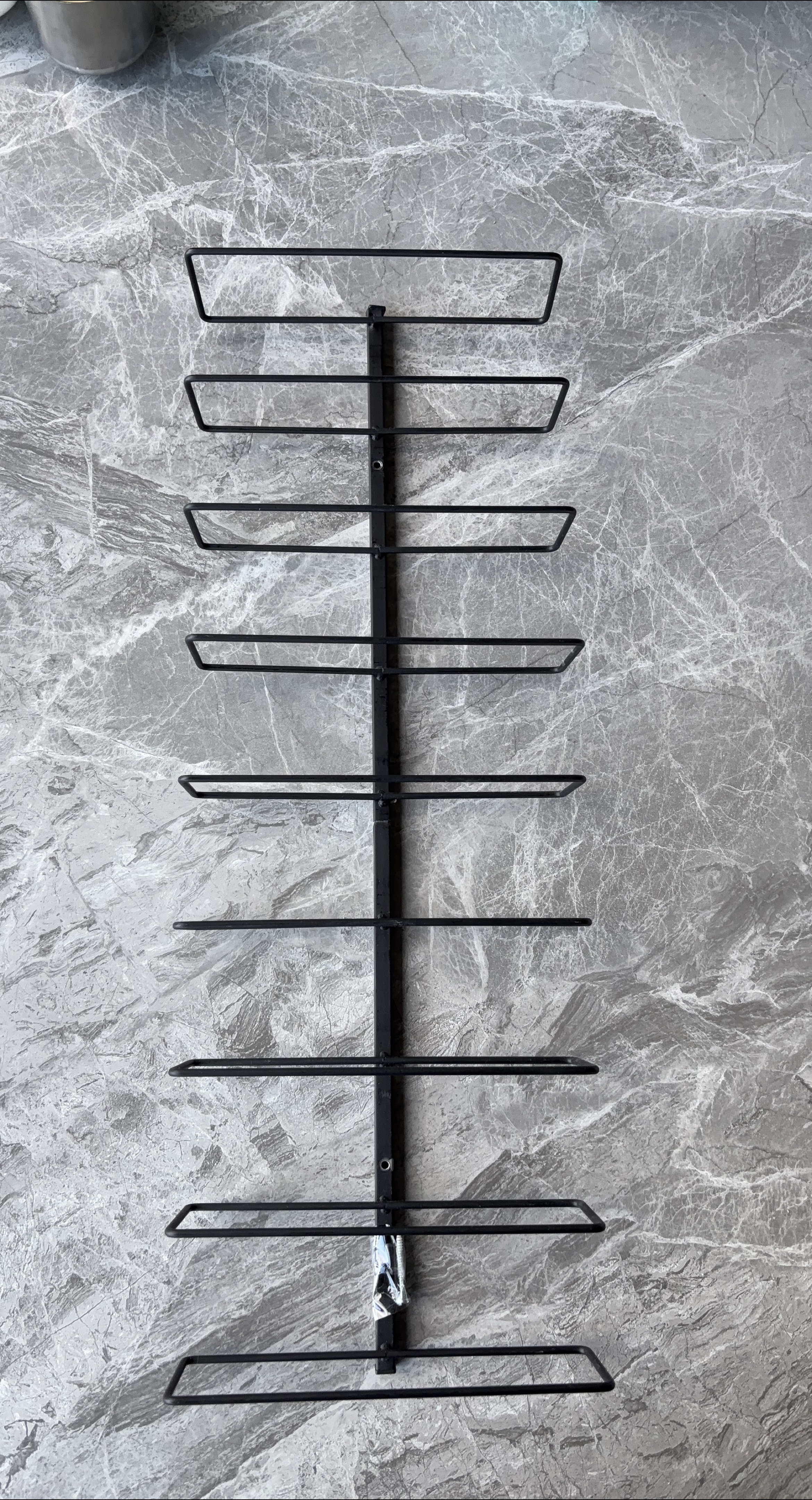 Selling a black metal wine rack that mounts to the wall! It has multiple tiers for storing 9 bottles of wine.