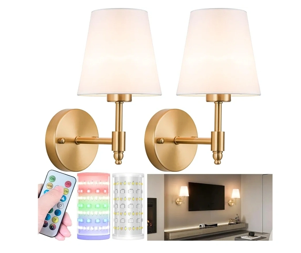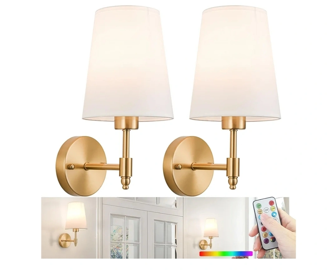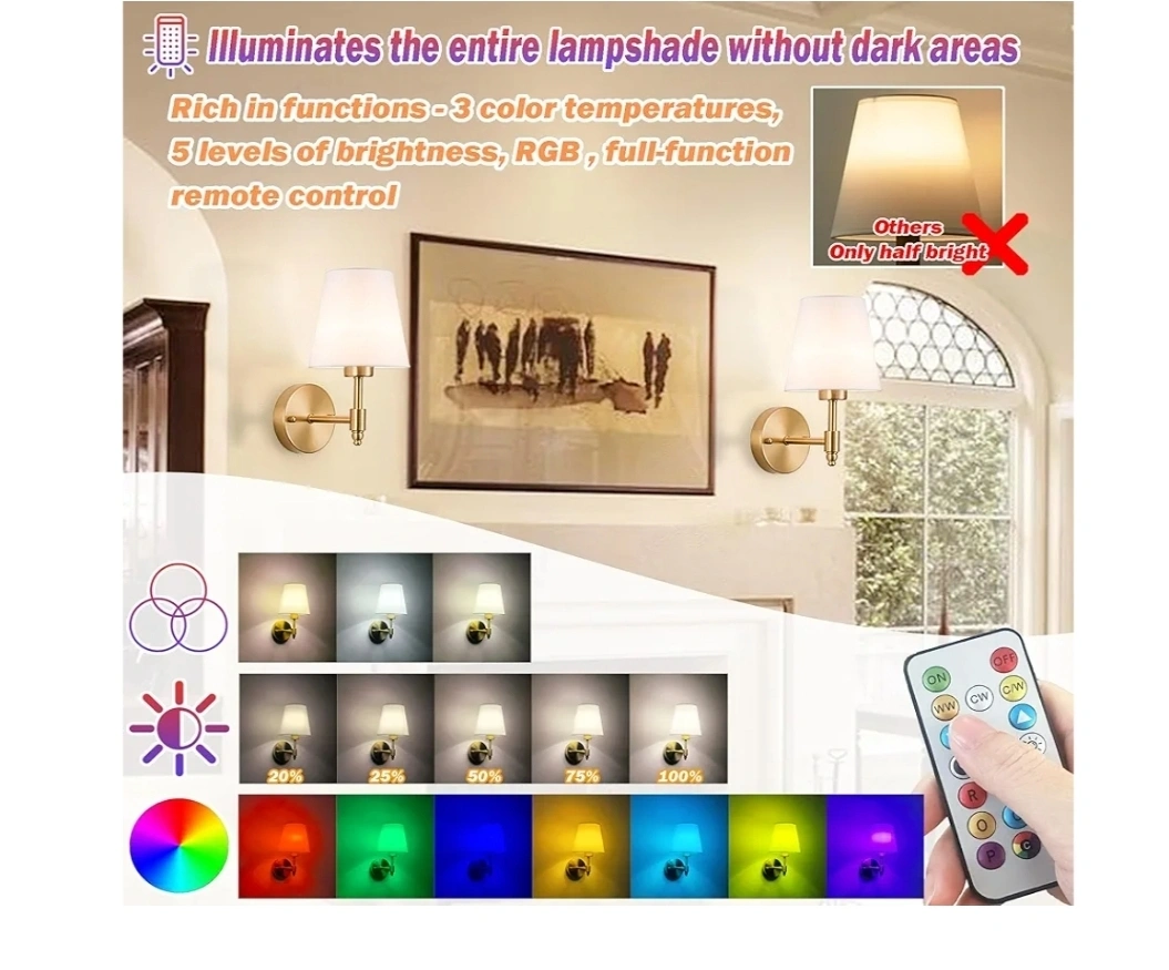 Selling a set of wall sconce lighting fixtures! They feature multiple color temperatures and brightness levels, controllable via remote. These sconces illuminate the entire lampshade without dark areas, providing a rich and full lighting experience