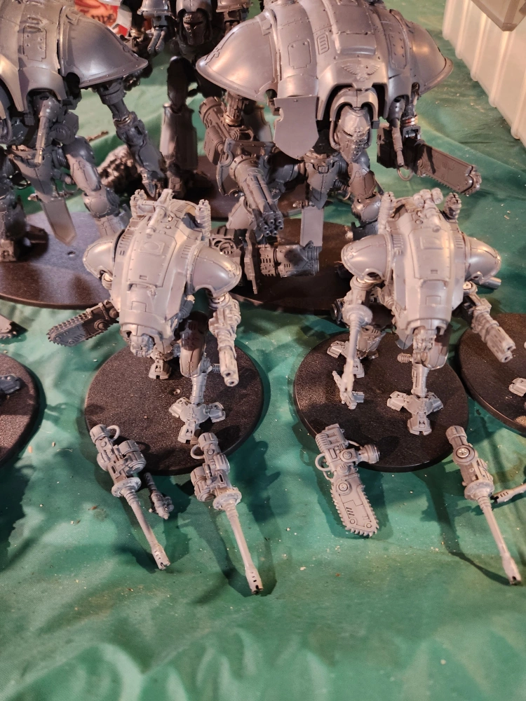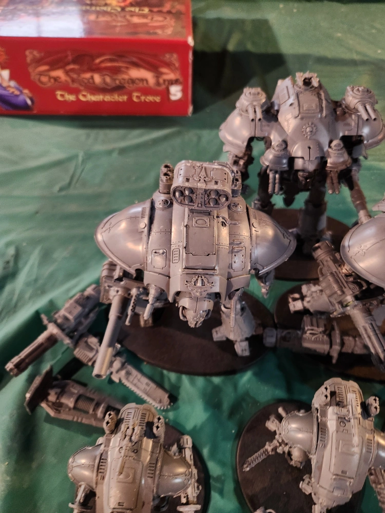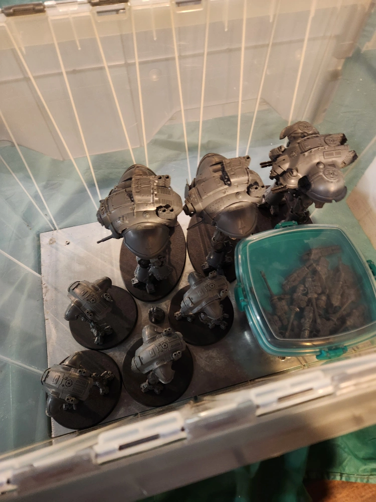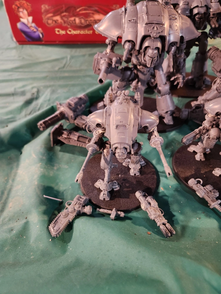 10looking to sell my imperial knights, all arms are magnetic and the top mounted weapons are push fit and not glued in, allowing yiu to easily swap, will be including my storage solution, the tote has a steel plate on the bottom as the bases are magnetic.