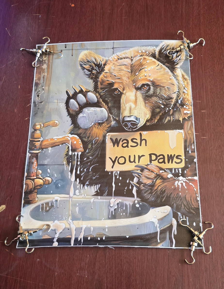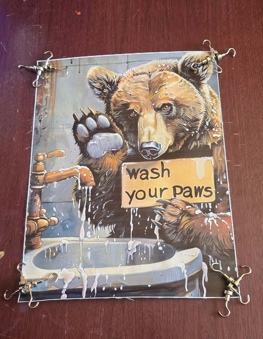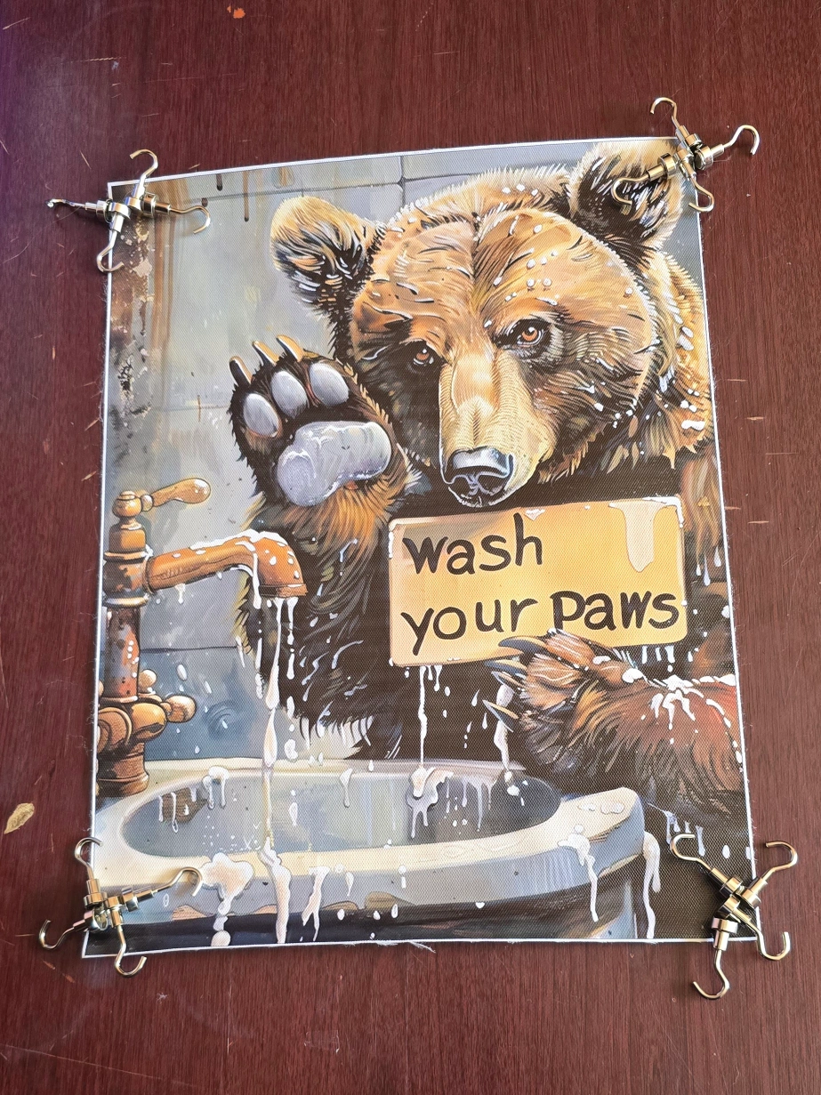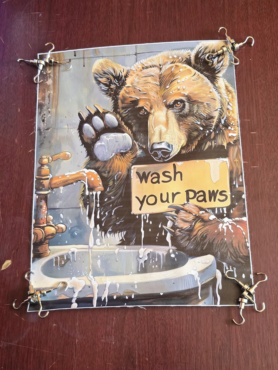 Unique wall art featuring a bear washing its paws! This quirky piece is sure to add some fun to any room. Great condition and ready to hang! we frame for free.