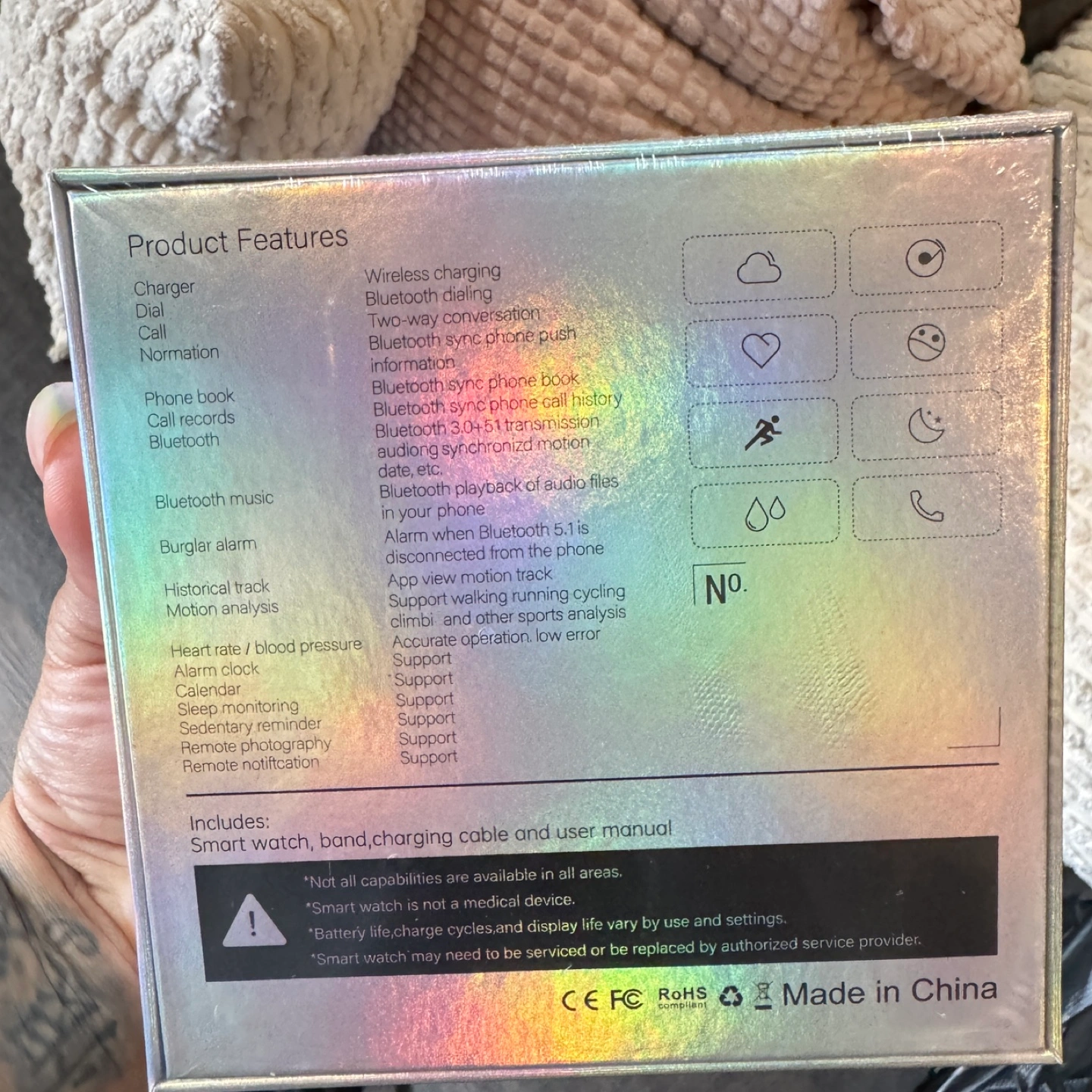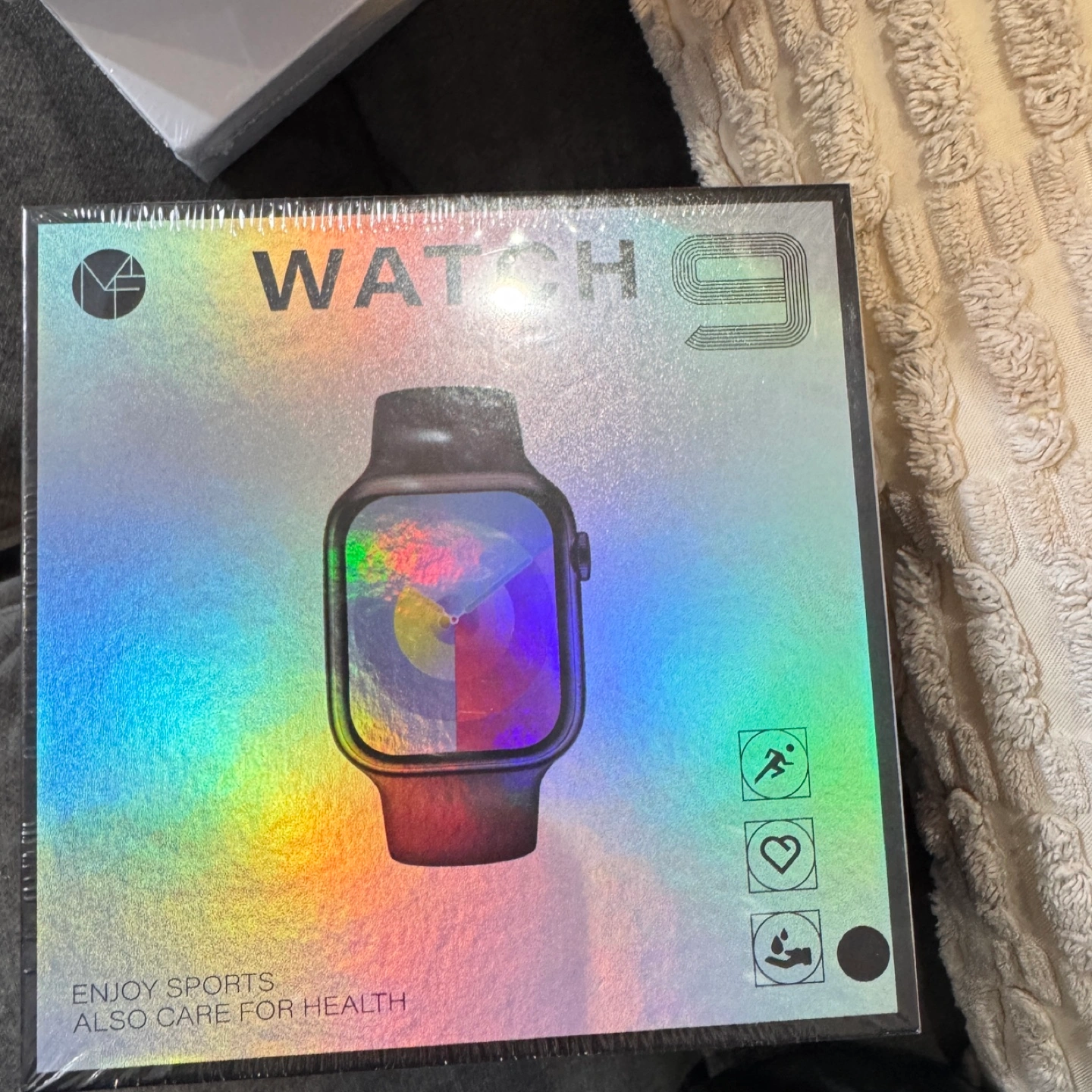 69A smartwatch in a box with features. The box has a holographic surface and features illustrations. A great way to keep track of your fitness journey and stay connected.