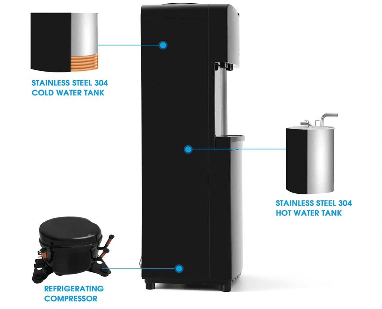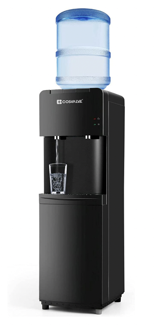 Water Cooler 5 Gallon Top Load,Hot/Cold Water Cooler Dispenser, Innovative Slim Design Energy Saving Freestanding with Child Safety Lock for Home or Office Black Used only for 20 gallons * COMPRESSOR REFRIGERATION - Equipped with a high-quality and energy-efficient compressor, this top loading water dispenser fits for 3 to 5 gallon water bottles and provides access to ice-cold or piping hot water in an instant with push button controls. * ENERGY SAVING & LOW NOISE - At the back of the water cooler, there are two hot and cold switches, red for stop heating, green for stop cooling. The water will not be heated over and over again, which assists you develop a healthy water-drinking habits and helps you save energy too. It's easy to set up and runs quietly. * CHILD SAFETY LOCK - The 5 gallon water dispenser comes with a very user-friendly security lock on the hot water tap to prevent accidental burns to your children. You don't have to be frightened about any safety risk from the water dispenser to your children. * INNOVATIVE & STYLISH DESIGN - The water machine loads from the top & allows you to spot if it's is running out of water. Measures just 11W*11.4D*36.4H inches to fit any space in your home, office or gym.