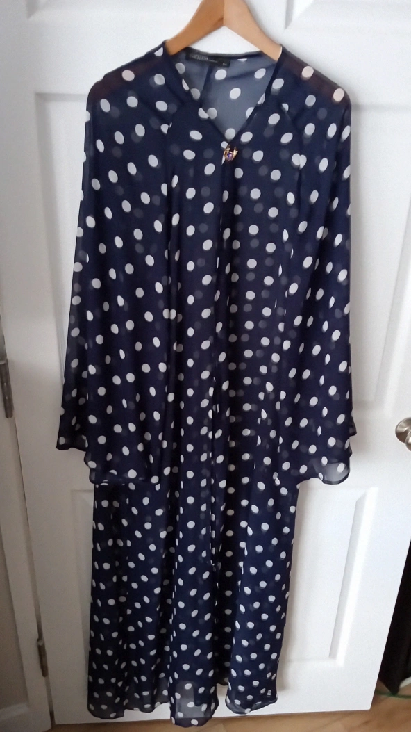 I'm selling a Zara cover-up in a navy blue color with white polka dots! It's a size XXXL and Tall, features a sheer, flowy material. Perfect for a stylish and comfortable look!