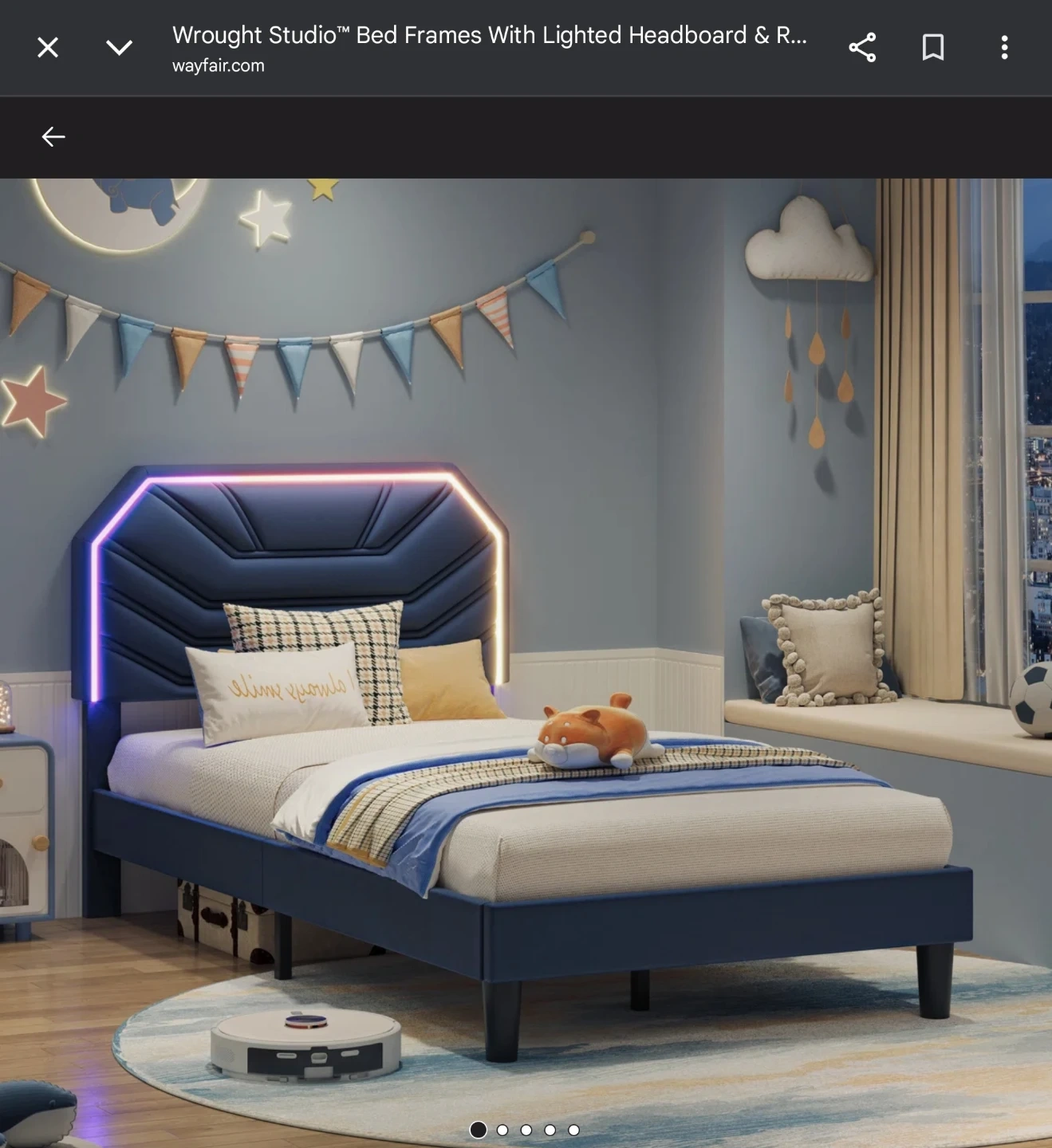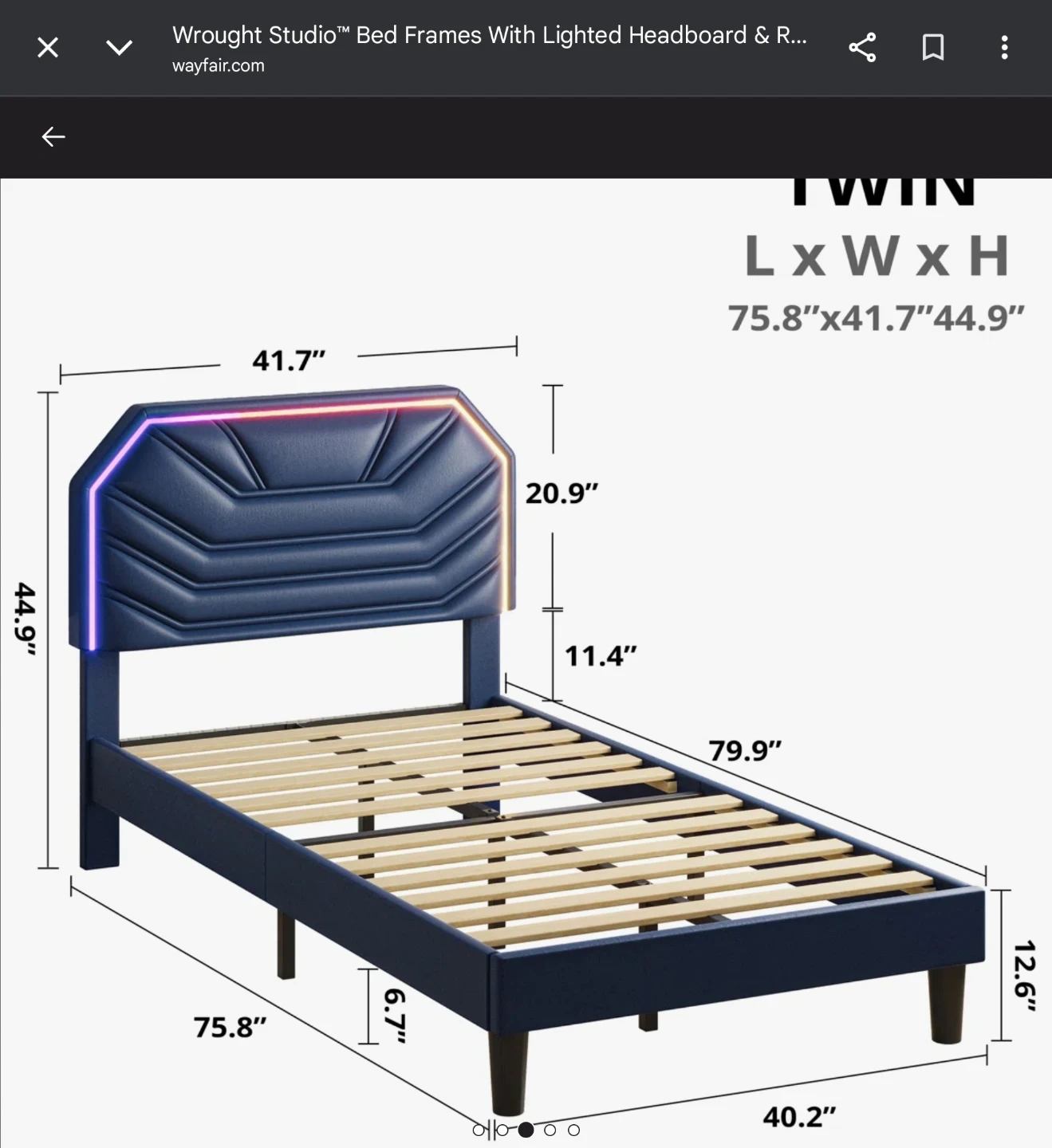 BRAND NEW NEVER OPENED! This twin bed frame features a navy blue upholstered headboard with integrated LED lighting. It includes a sturdy wooden slat support system. The overall dimensions are 75.8" L x 41.7" W x 44.9" H.