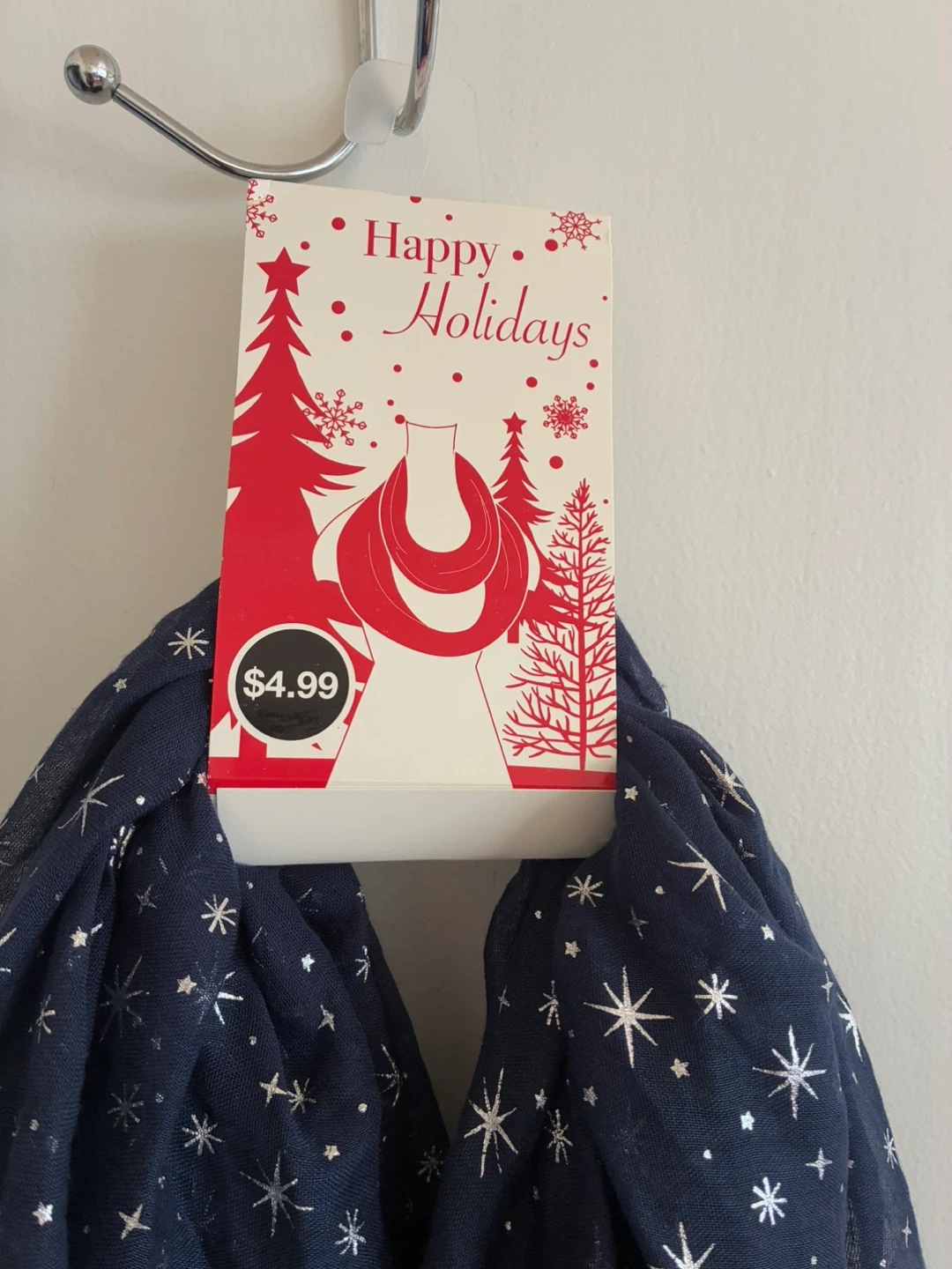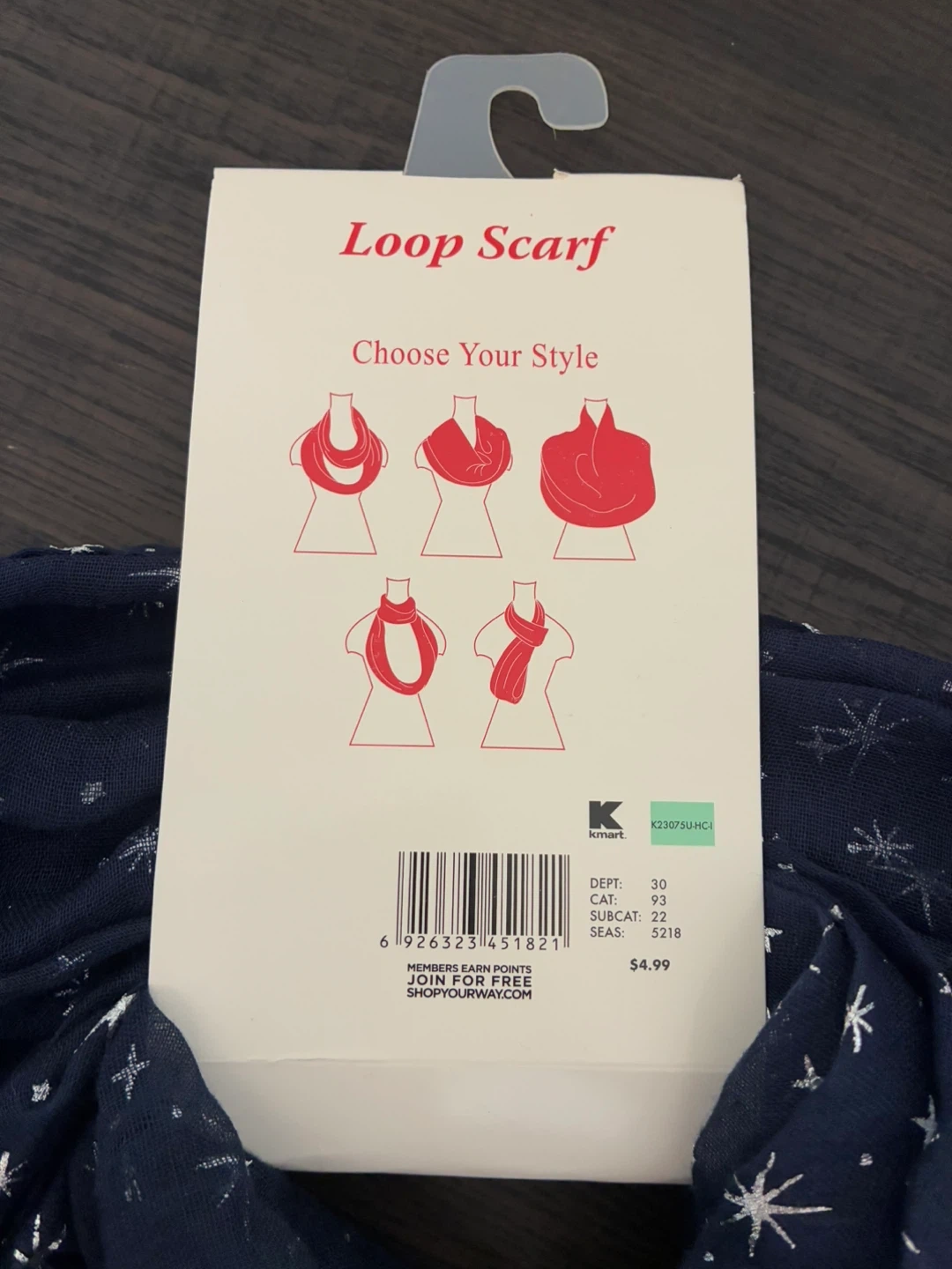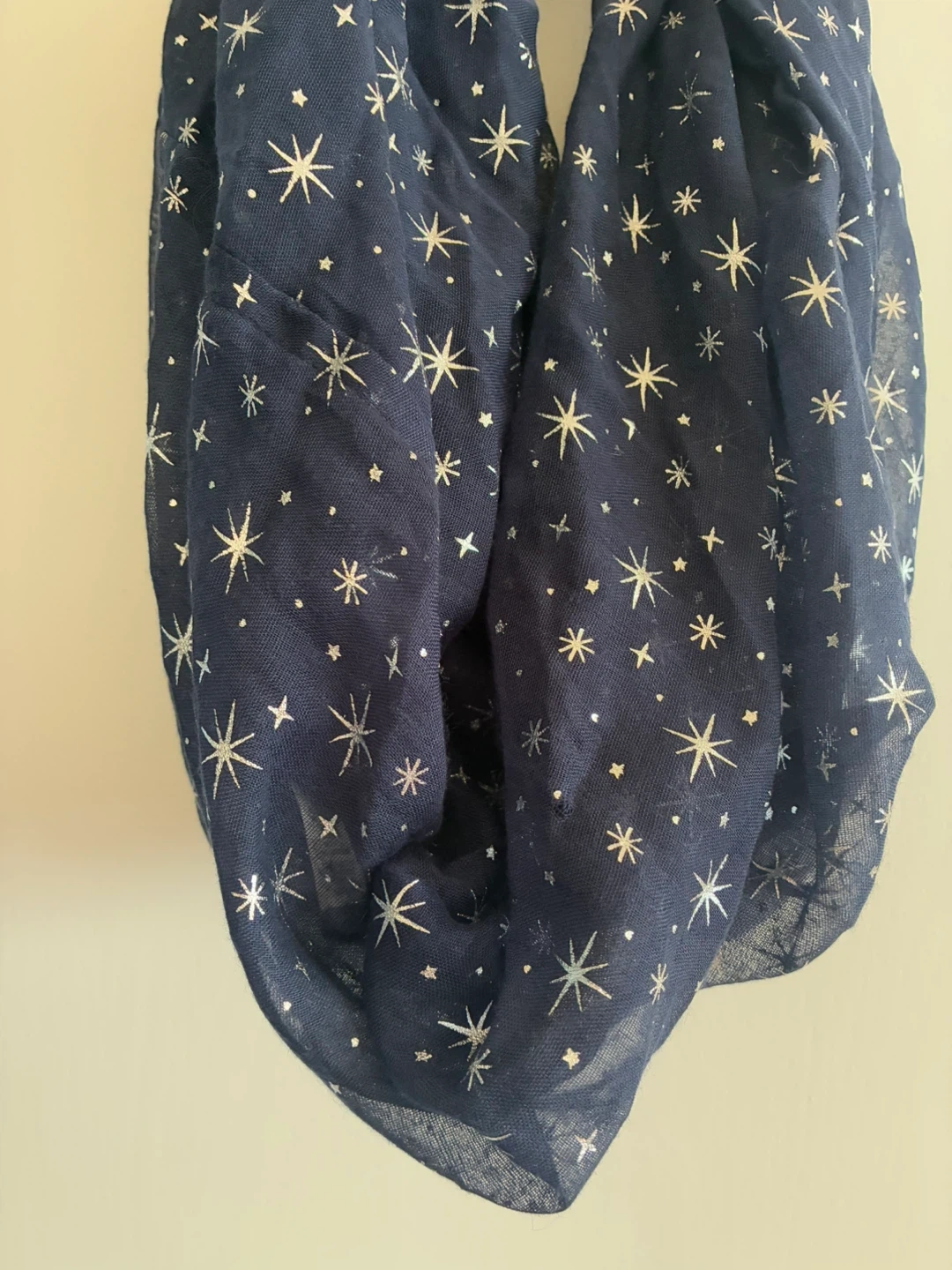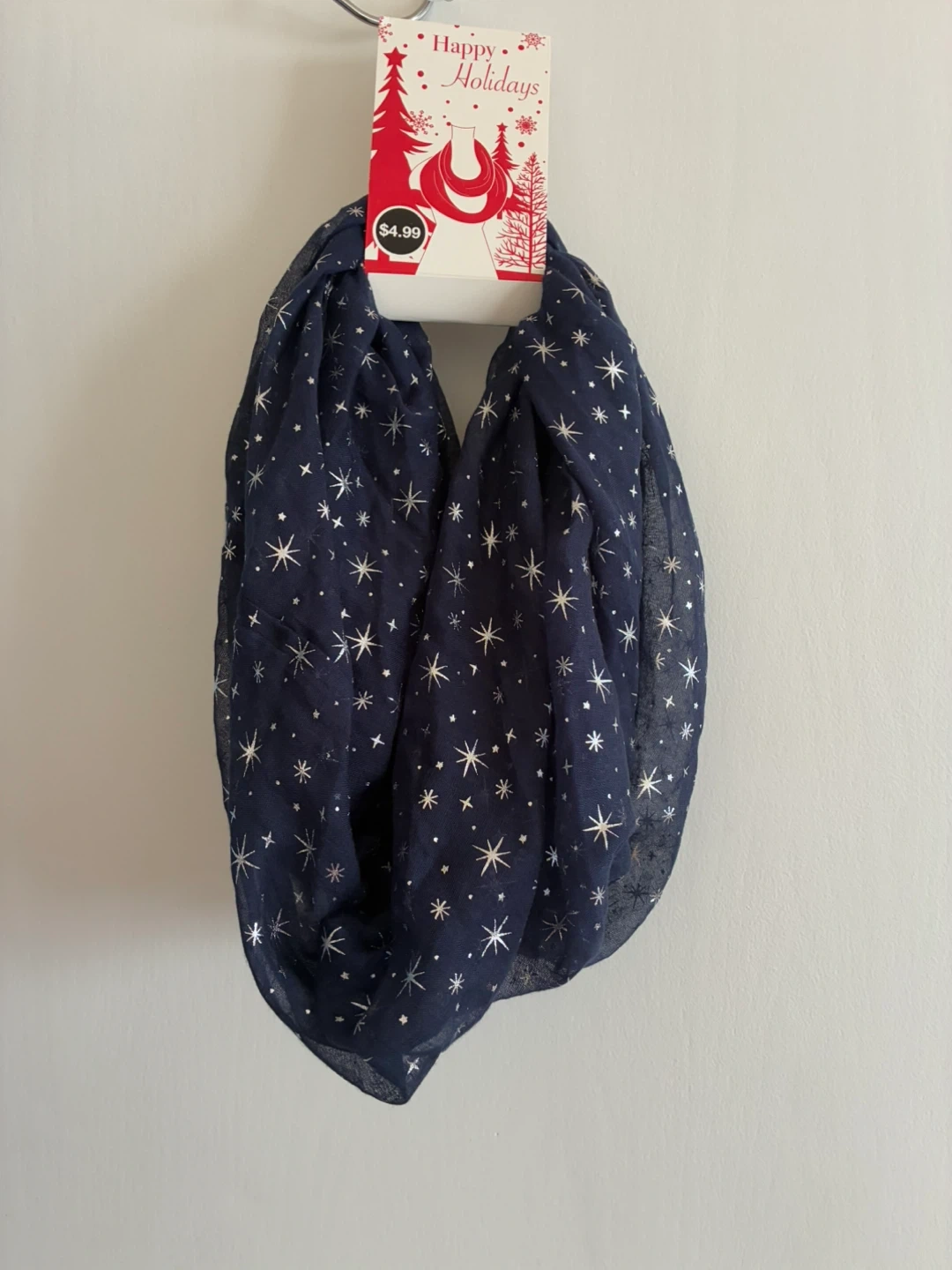 This is a K Accessories infinity scarf with a cute star pattern. It's a loop scarf, made of 100% polyester. It's in great condition and ready to keep you cozy!