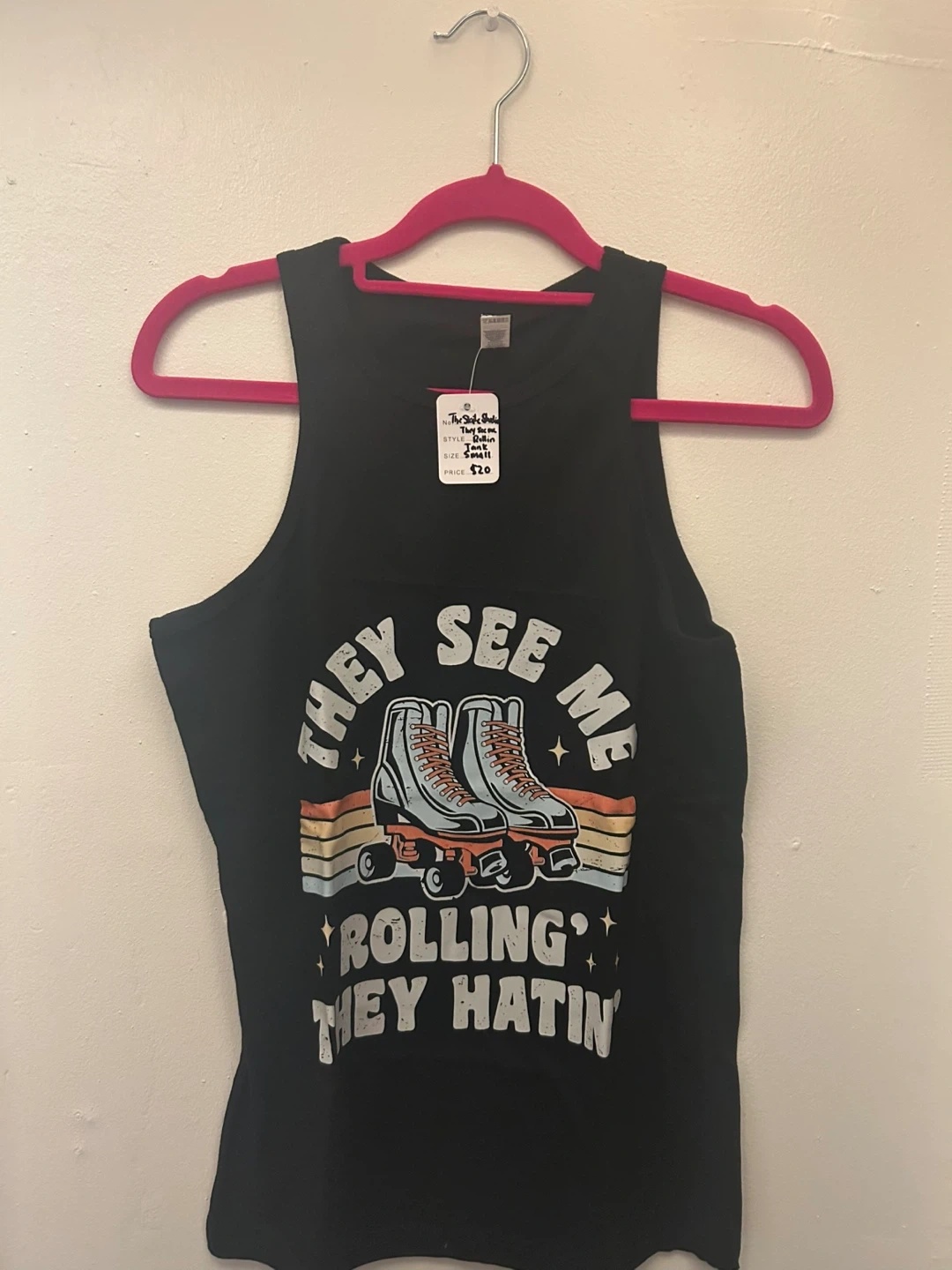 Cute black tank top from The Skate Studio! It's a size small and features a fun roller skate design. The tag shows it was originally $20