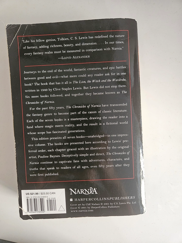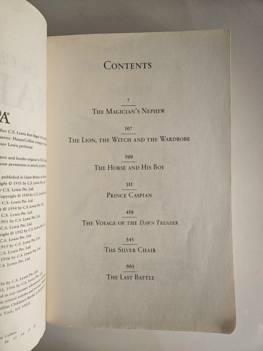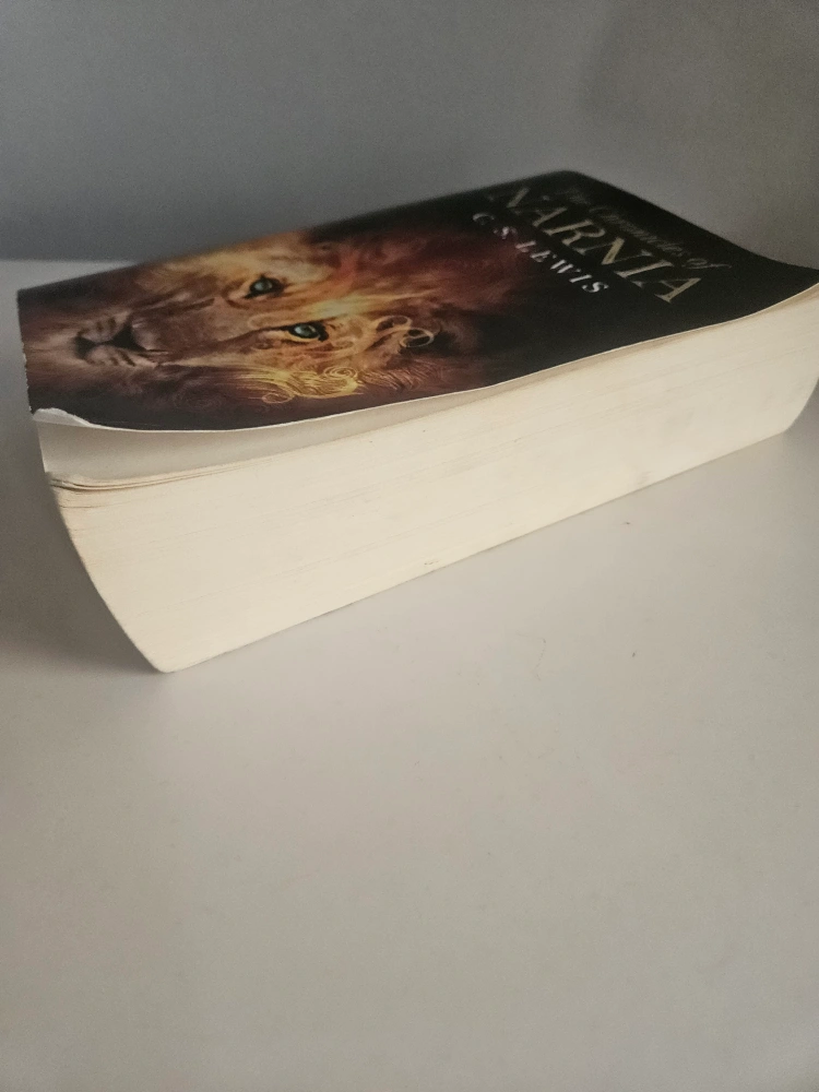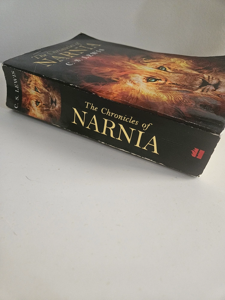 Paperback book of the complete series of the Chronicles od Narina including The Magician's Nephew, The Lion, The Witch and the Wardrobe, The Horse and His Boy, Prince Caspian, The Voyage of the Dawn Treader, The Silver Chair, and The Last Battle.