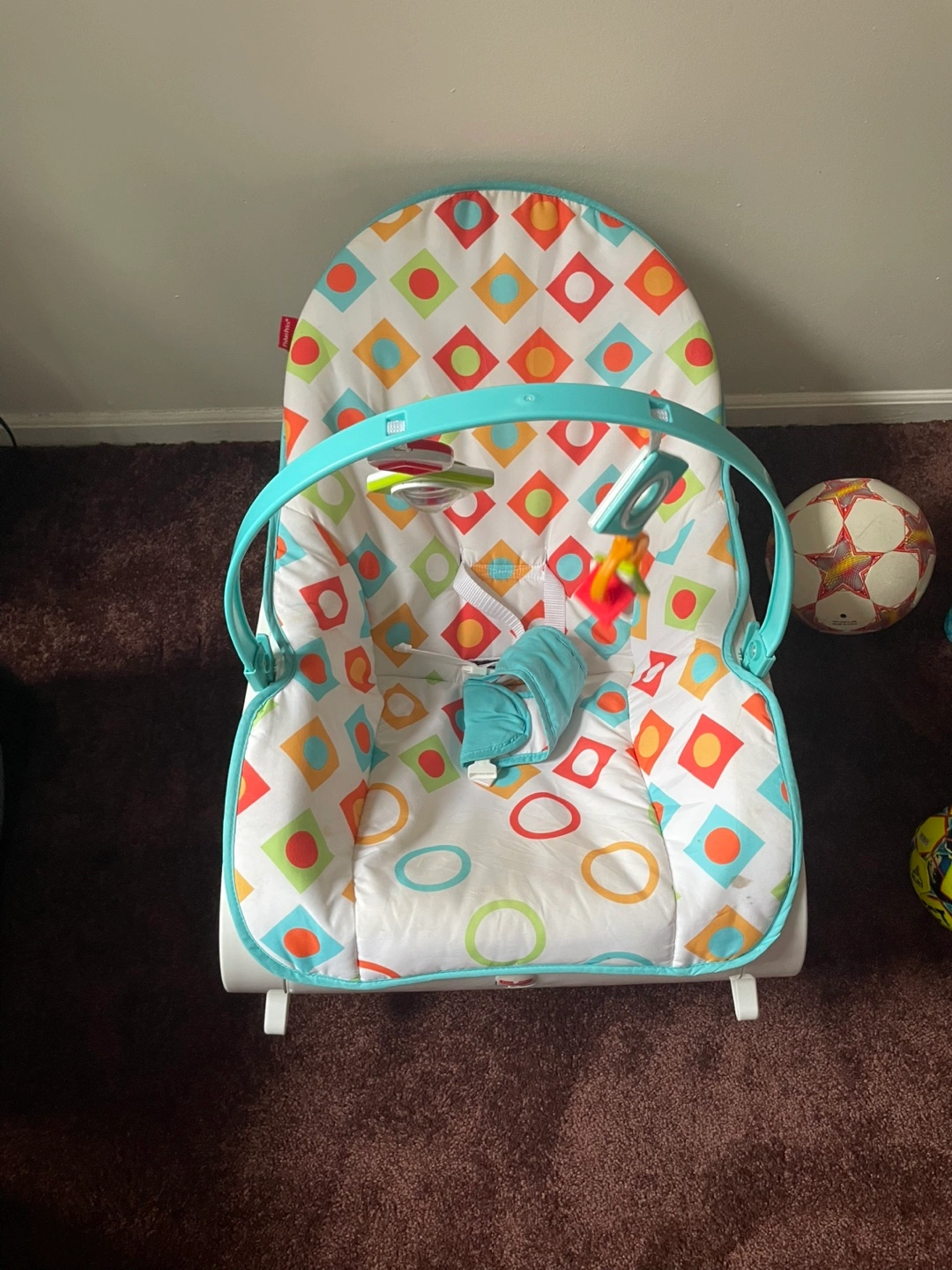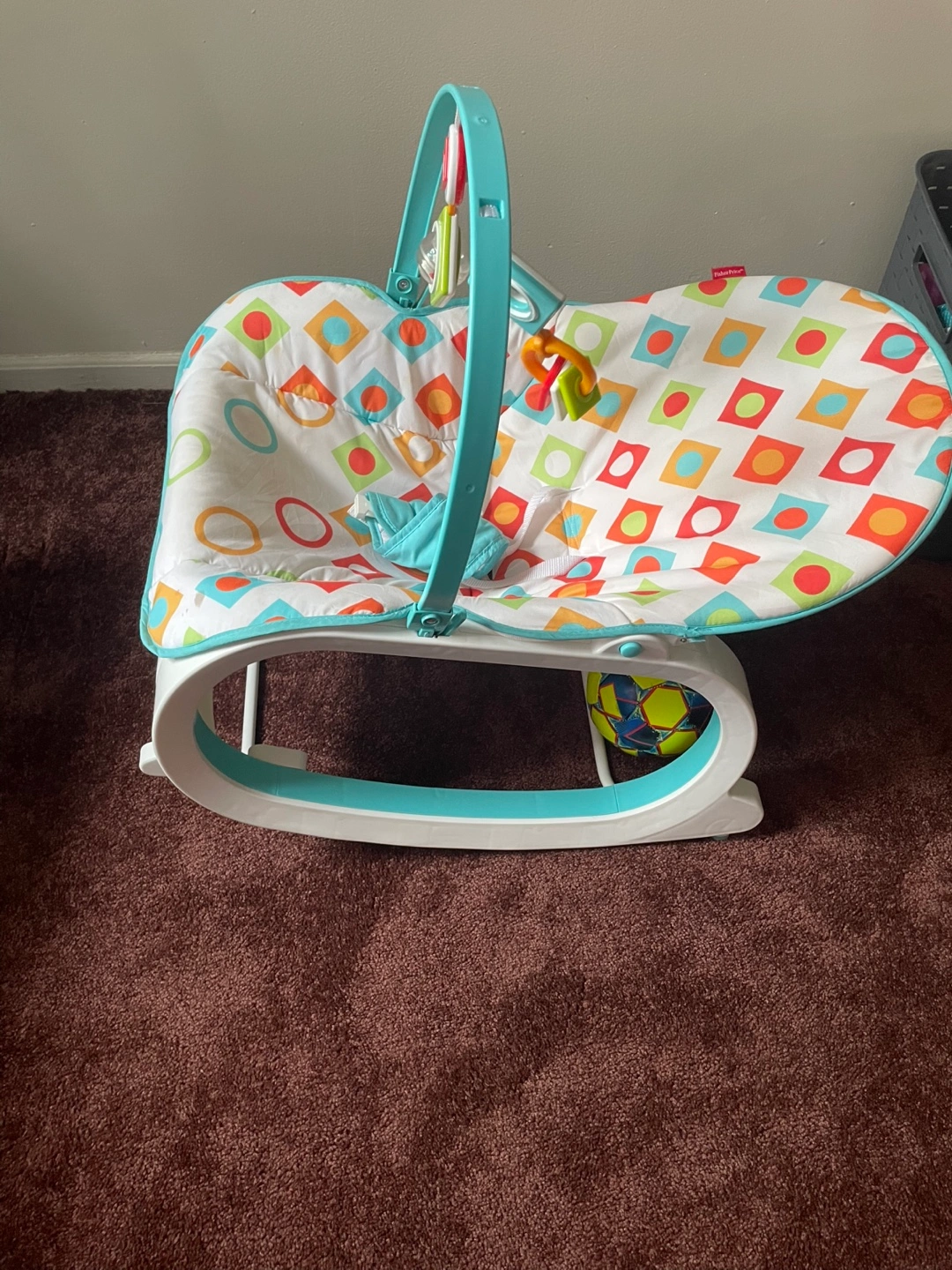 Infant rocker, teal and white frame. Colorful, geometric pattern fabric. Includes toy bar with hanging toys. Gently used.