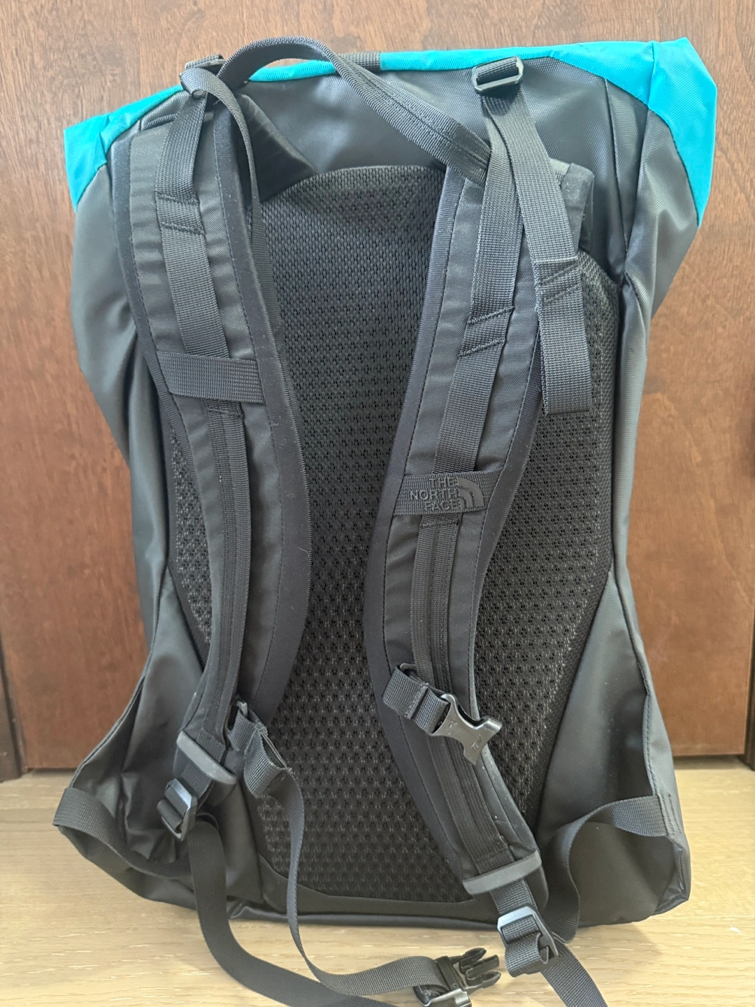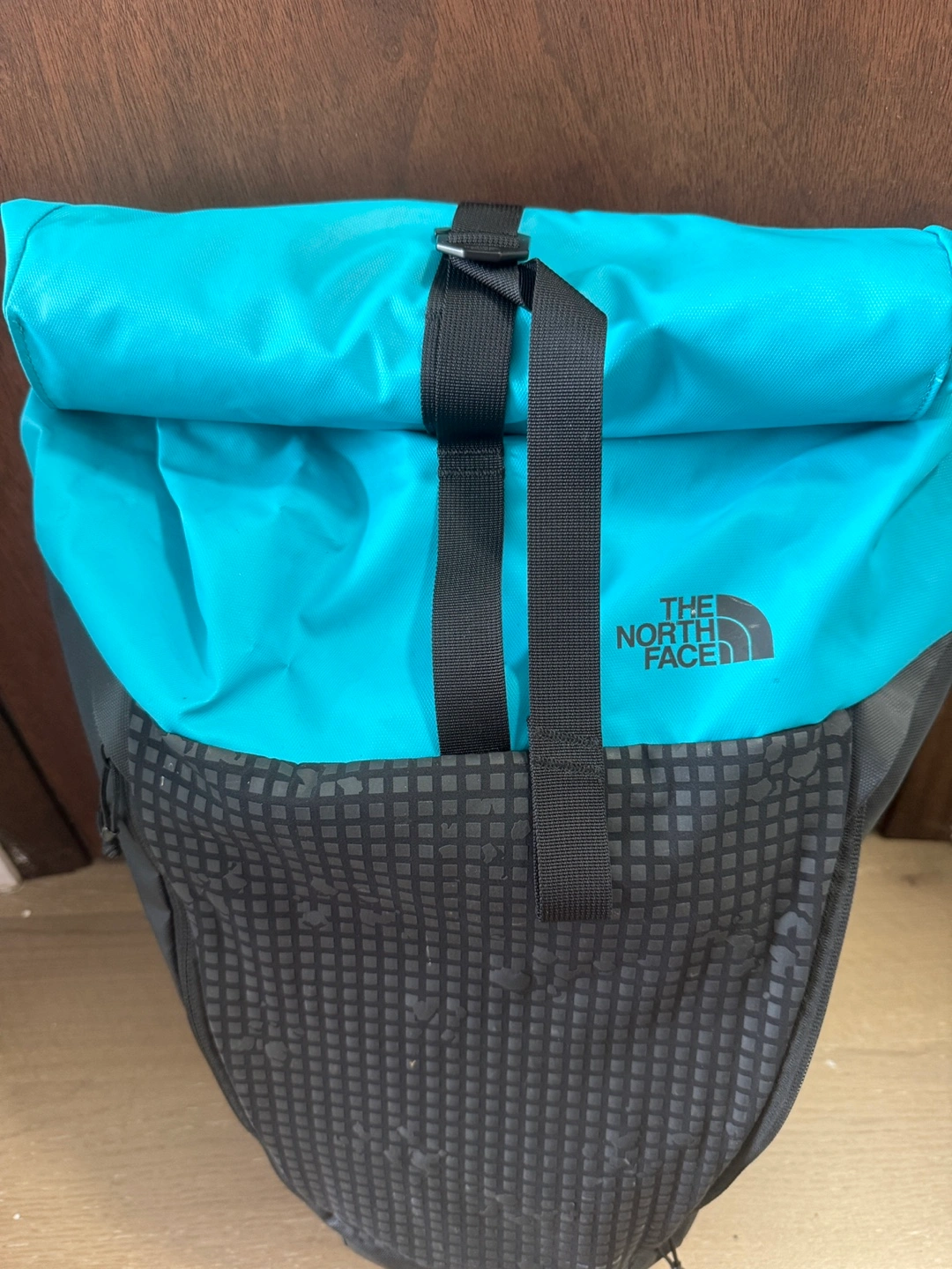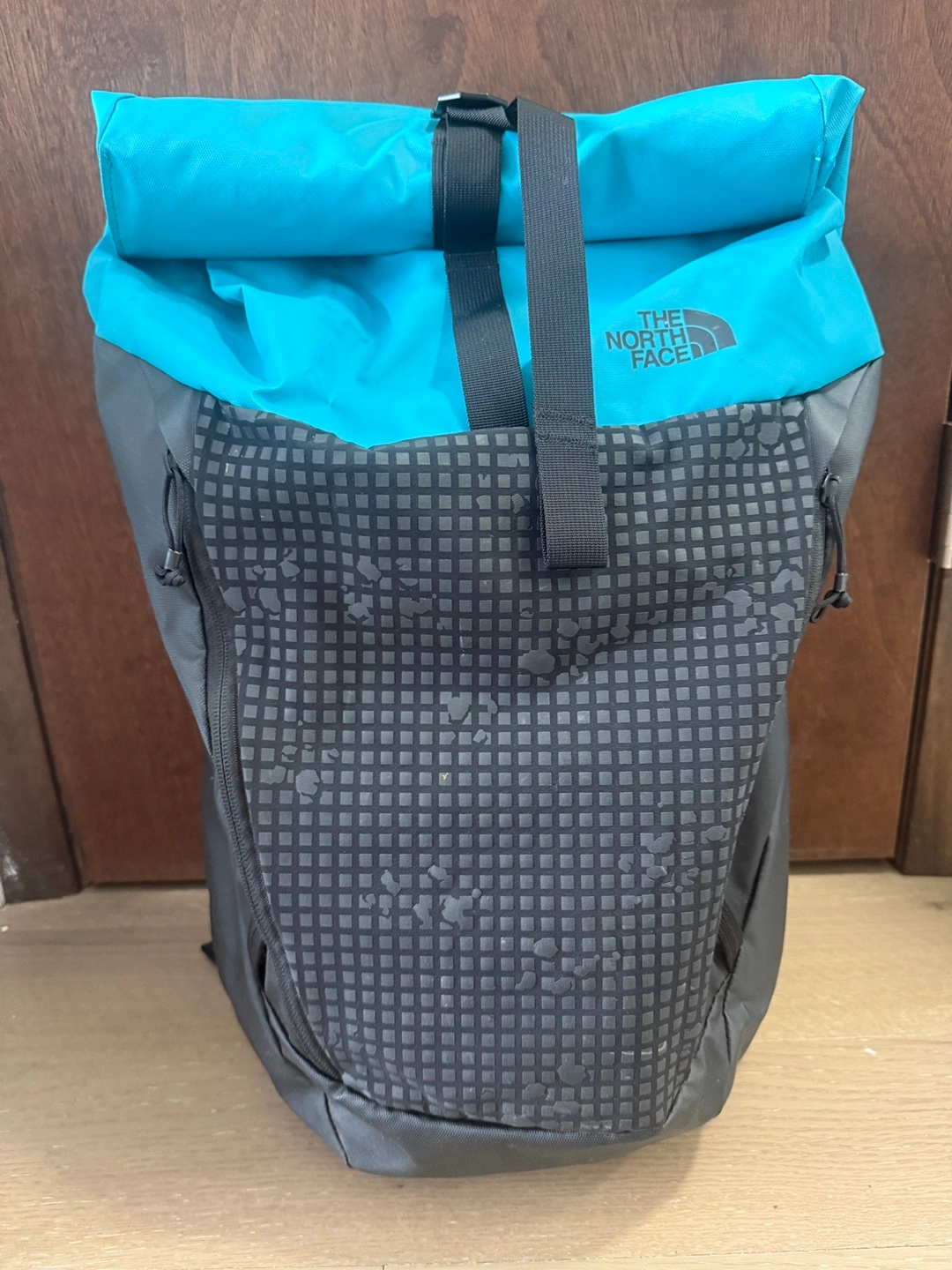 Selling a The North Face backpack in good condition. It features a roll-top closure and a stylish black and gray patterned design on the front. Perfect for everyday use or outdoor adventures!