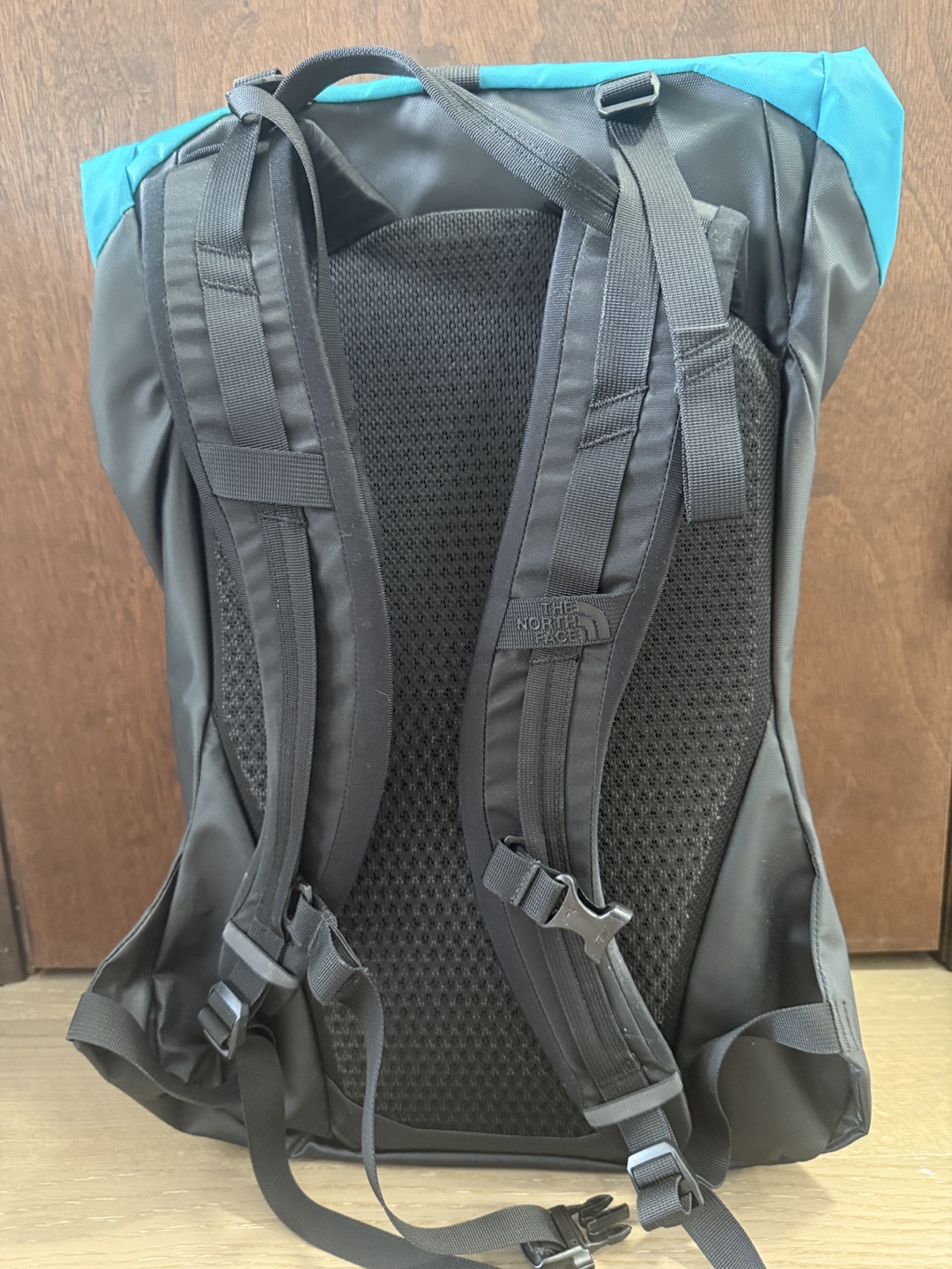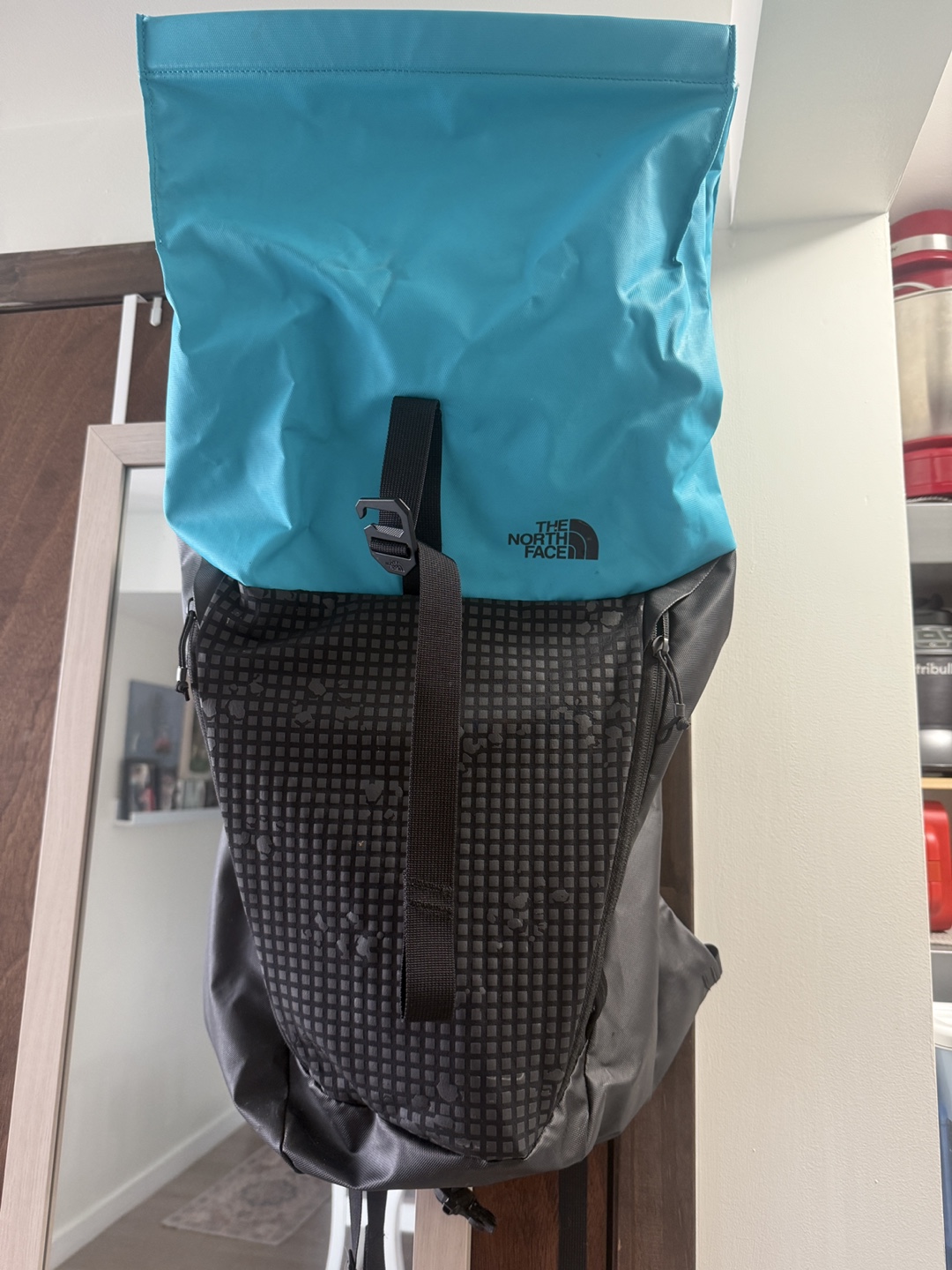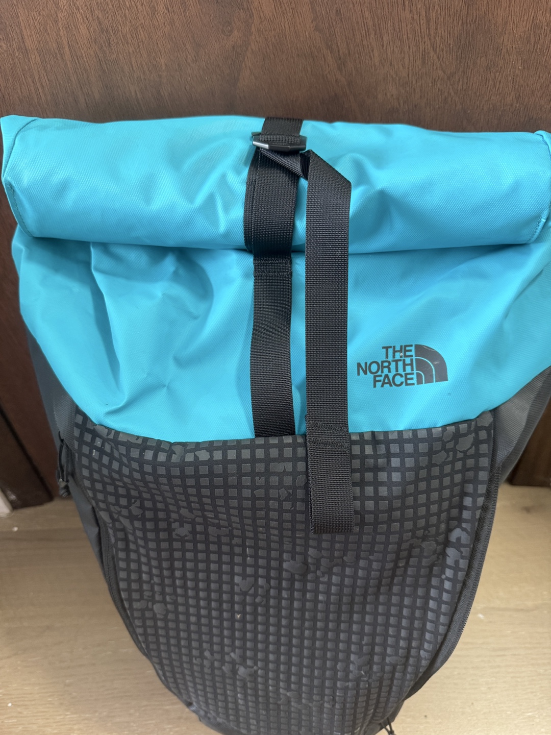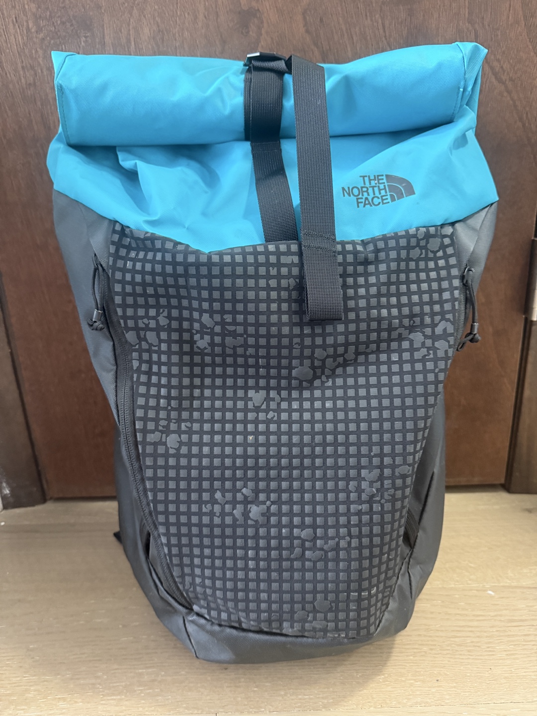 Selling a The North Face backpack in good condition. It features a roll-top closure and a stylish black and gray patterned design on the front. Perfect for everyday use or outdoor adventures!