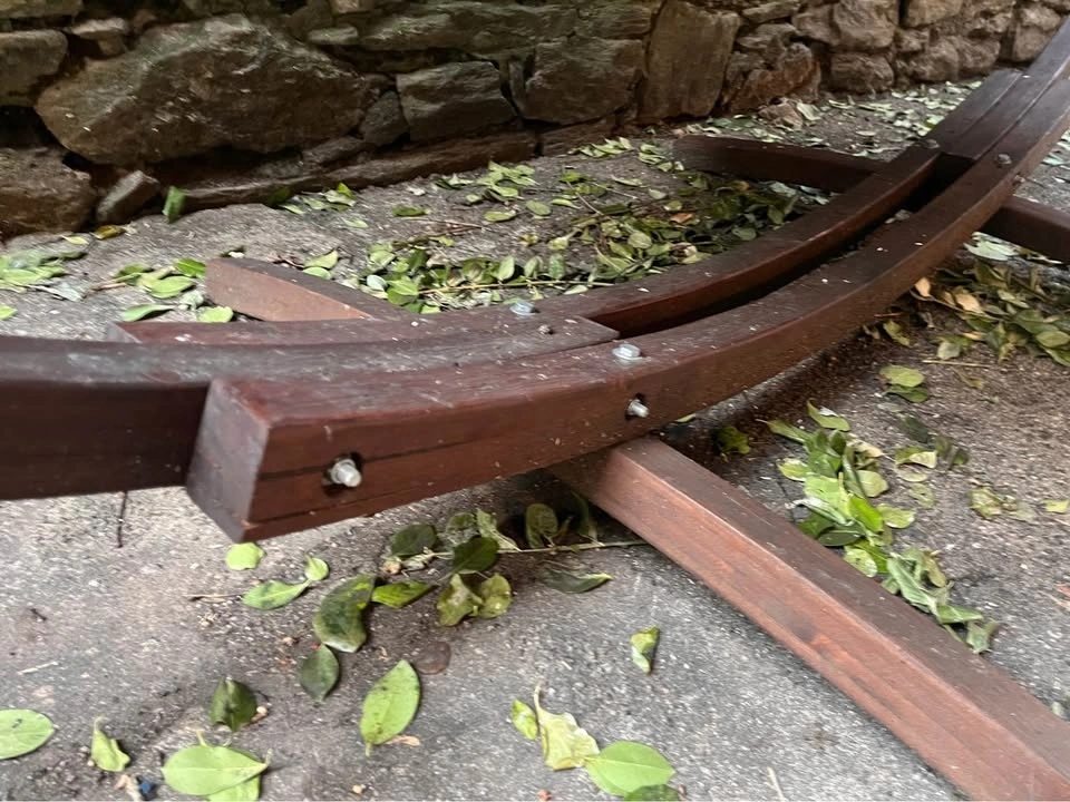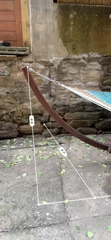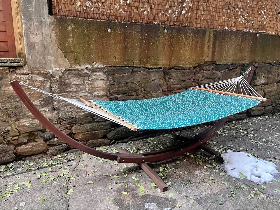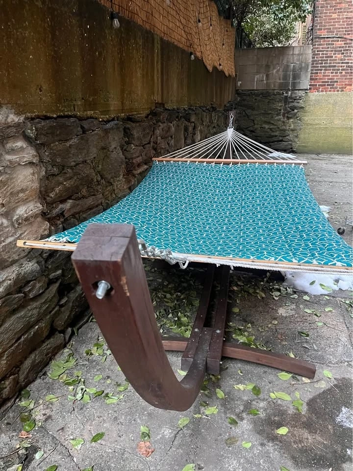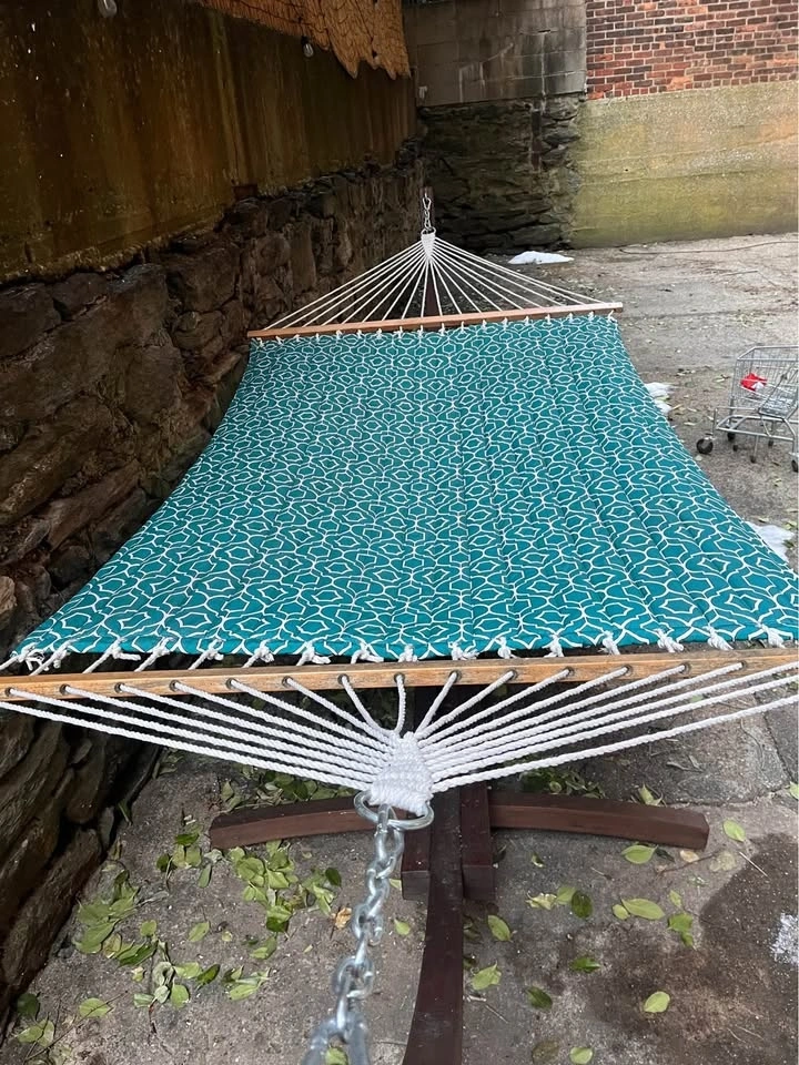Stylish outdoor hammock with a cool teal and white geometric pattern. Has a sturdy wooden stand. Perfect for relaxing outside. Pick up upper west side. will disassemble the frame for transportation.