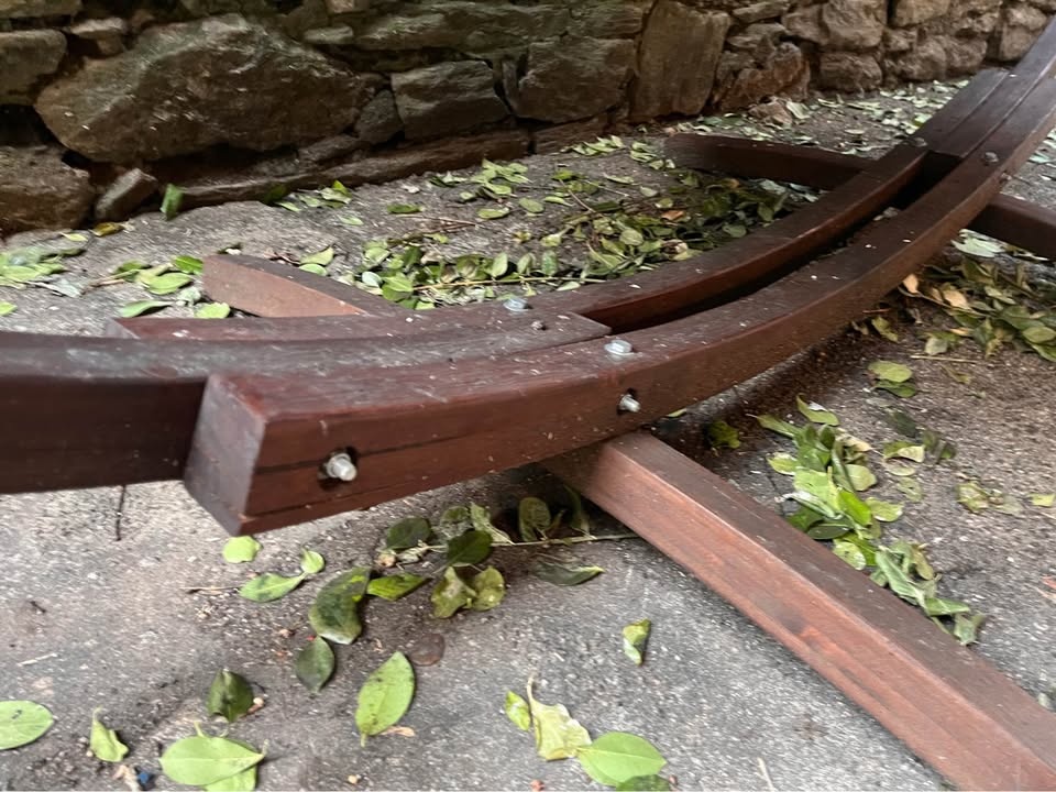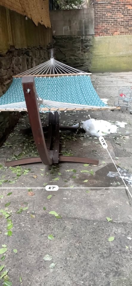 Stylish outdoor hammock with a cool teal and white geometric pattern. Has a sturdy wooden stand. Perfect for relaxing outside. Pick up upper west side. will disassemble the frame for transportation.