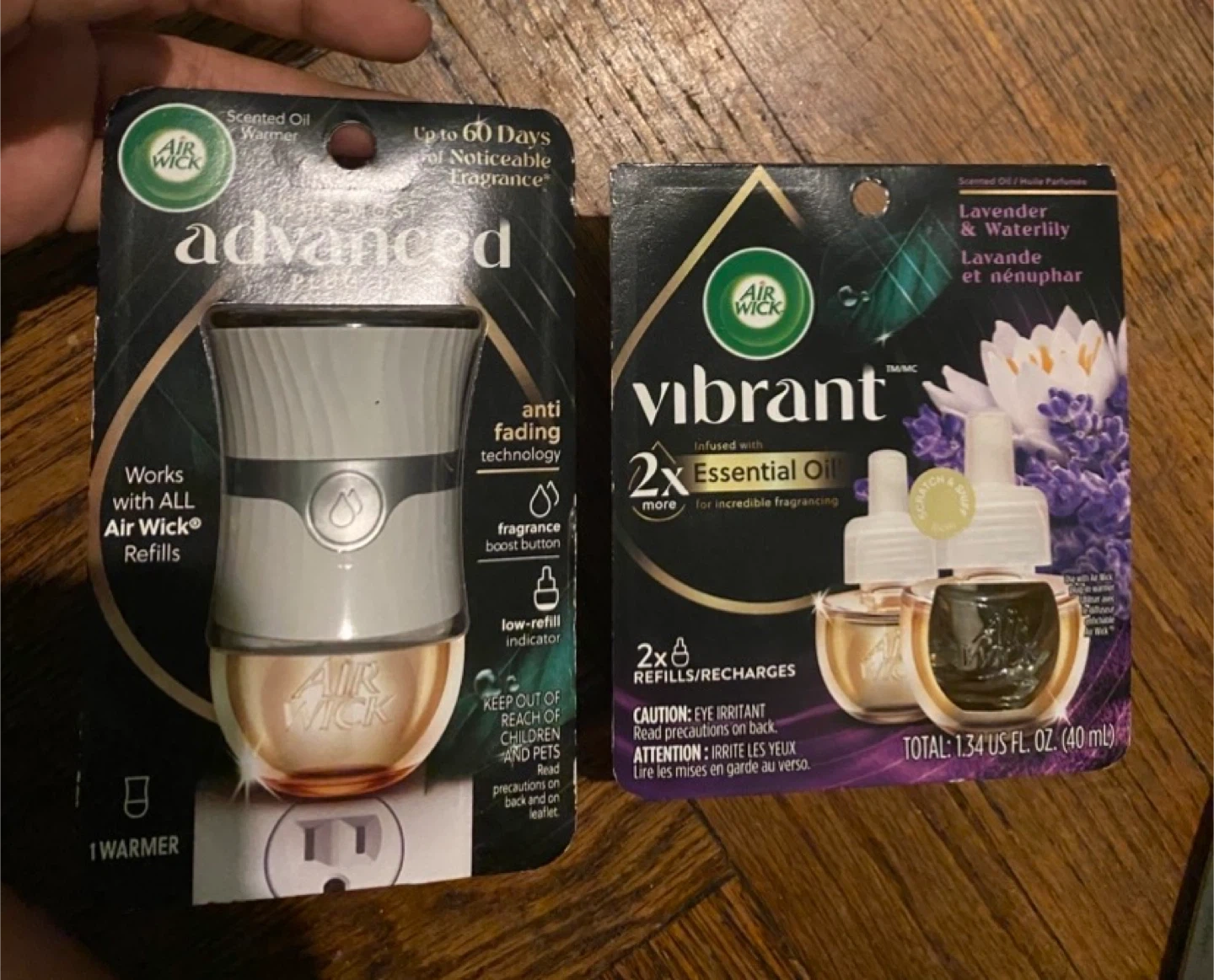 Air Wick Advanced Scented Oil Warmer and Lavender & Waterlily refills. It works with all Air Wick refills and has a low-refill indicator. The refills are infused with 2x essential oil for incredible fragrancing. Total refill volume is 1.34 US fl. oz. (40 mL).