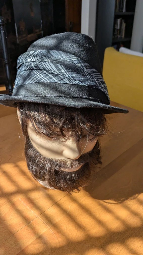 A stylish black fedora hat. Features a black and gray plaid ribbon band around the base. The hat appears to be made of a felt-like material.