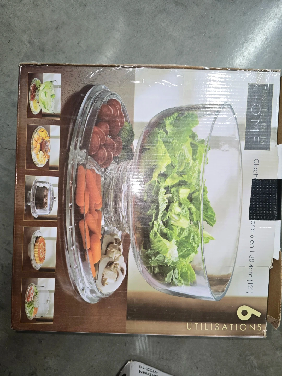 This versatile glass serving set includes a dessert dome and a multi-compartment platter. It's perfect for displaying cakes, serving appetizers, or presenting salads. The set is made of clear glass and offers multiple uses for entertaining.