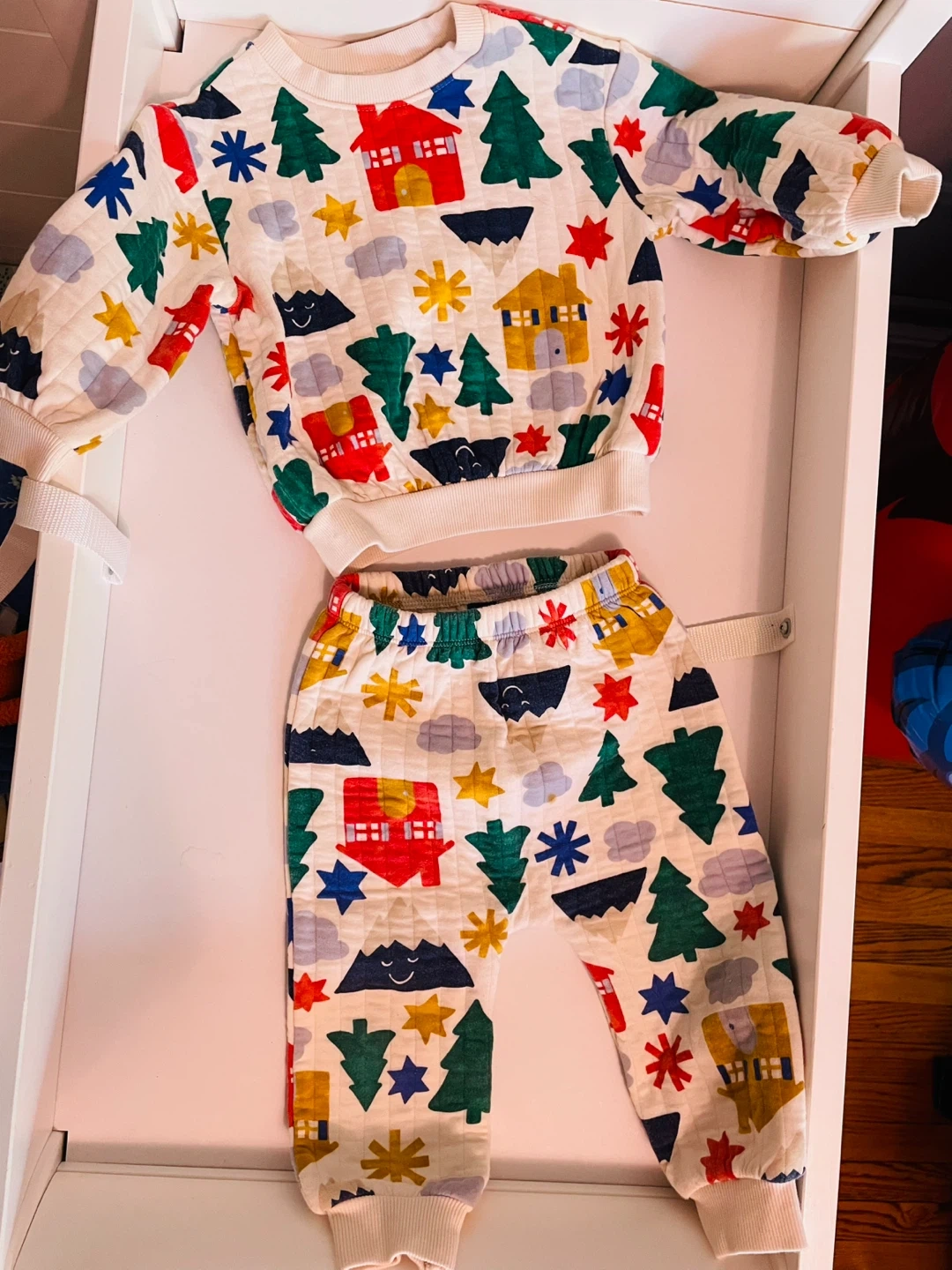 Cute Old Navy baby outfit, size 18-24 months! The set features a fun, colorful pattern with houses, trees, and stars. Perfect for your little one to play in.