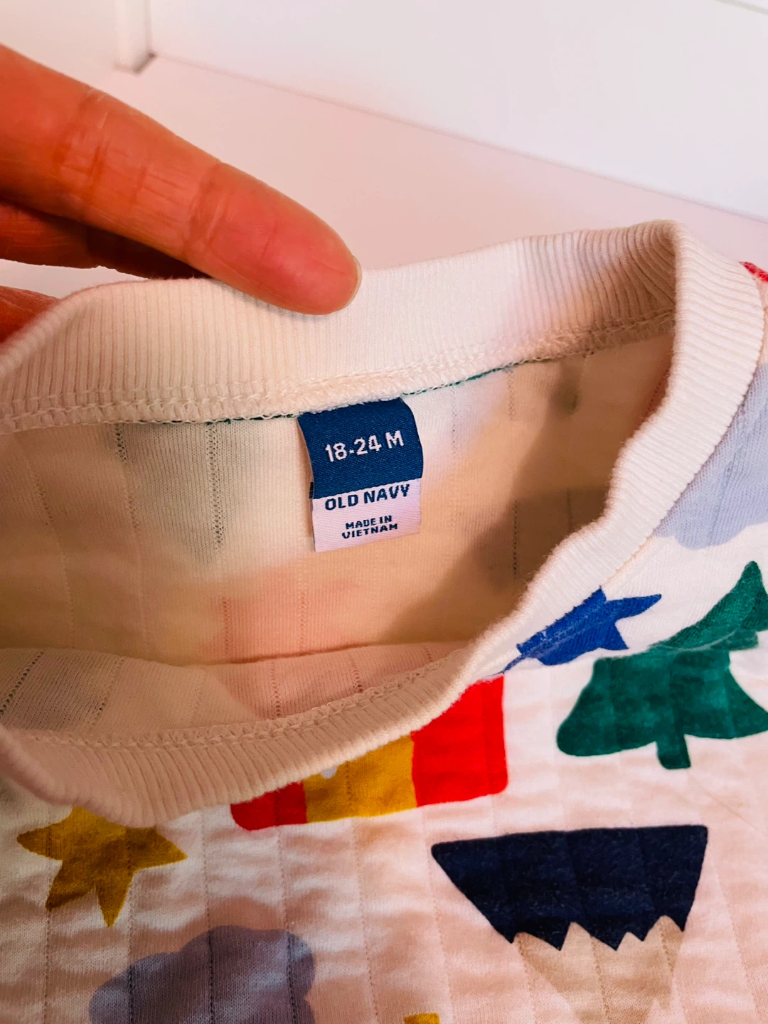 Cute Old Navy baby outfit, size 18-24 months! The set features a fun, colorful pattern with houses, trees, and stars. Perfect for your little one to play in.