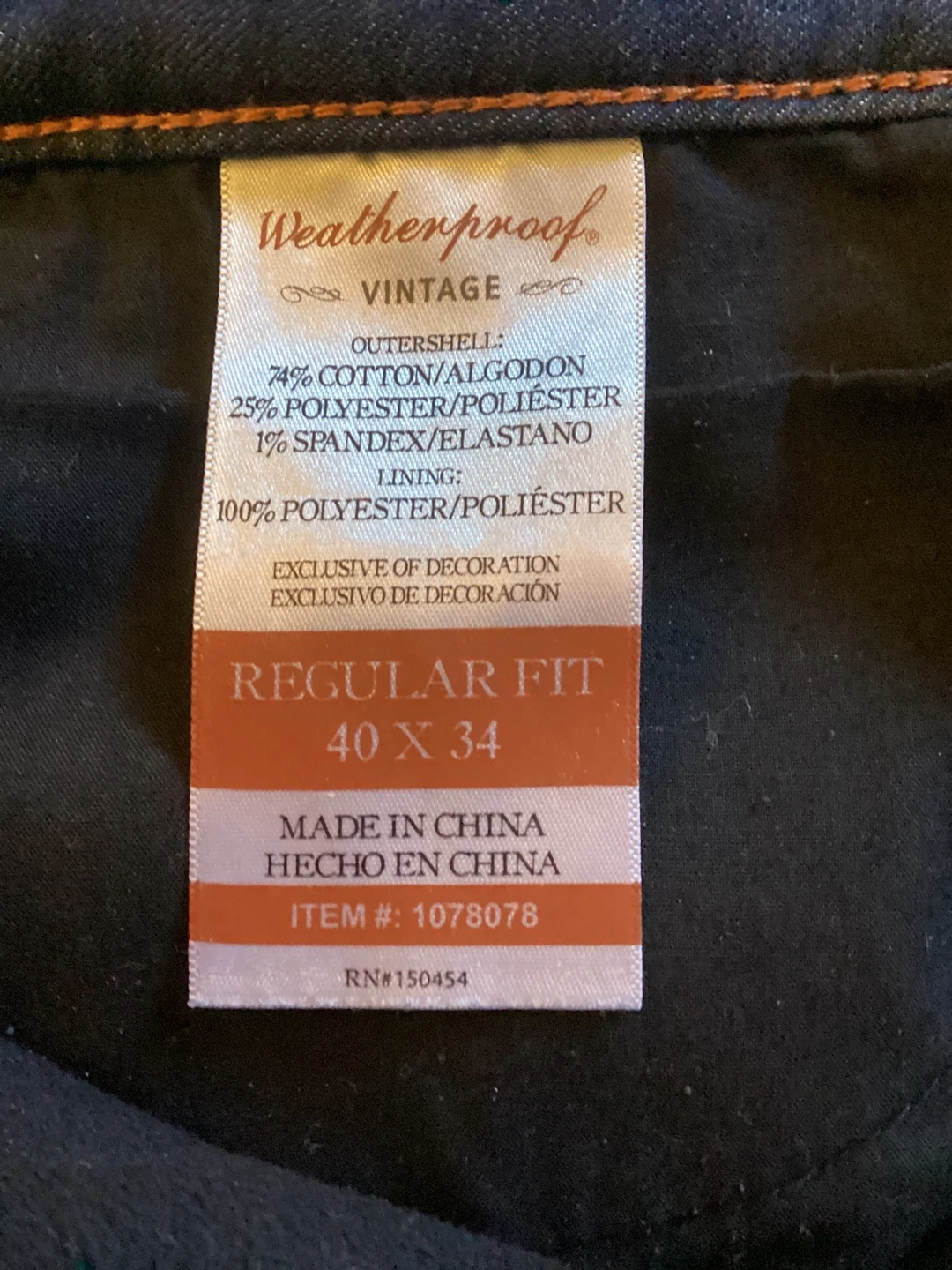 Weatherproof Vintage jeans in size 40x34. These are a regular fit and made with a blend of 74% cotton, 25% polyester, and 1% spandex