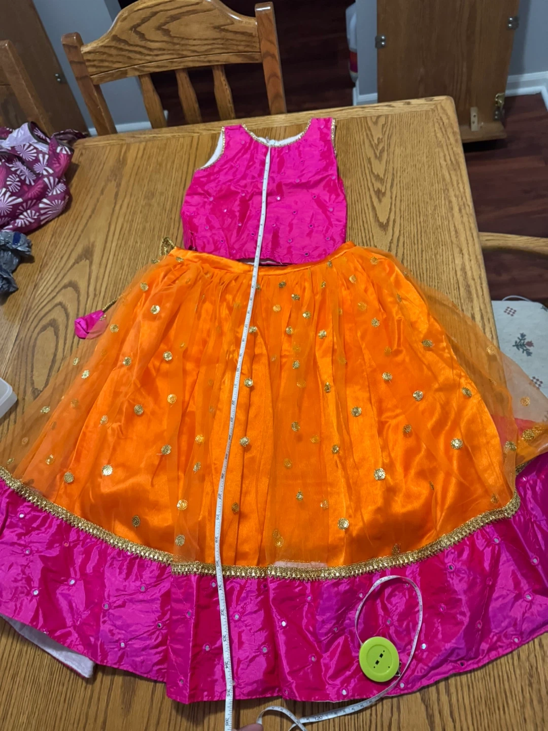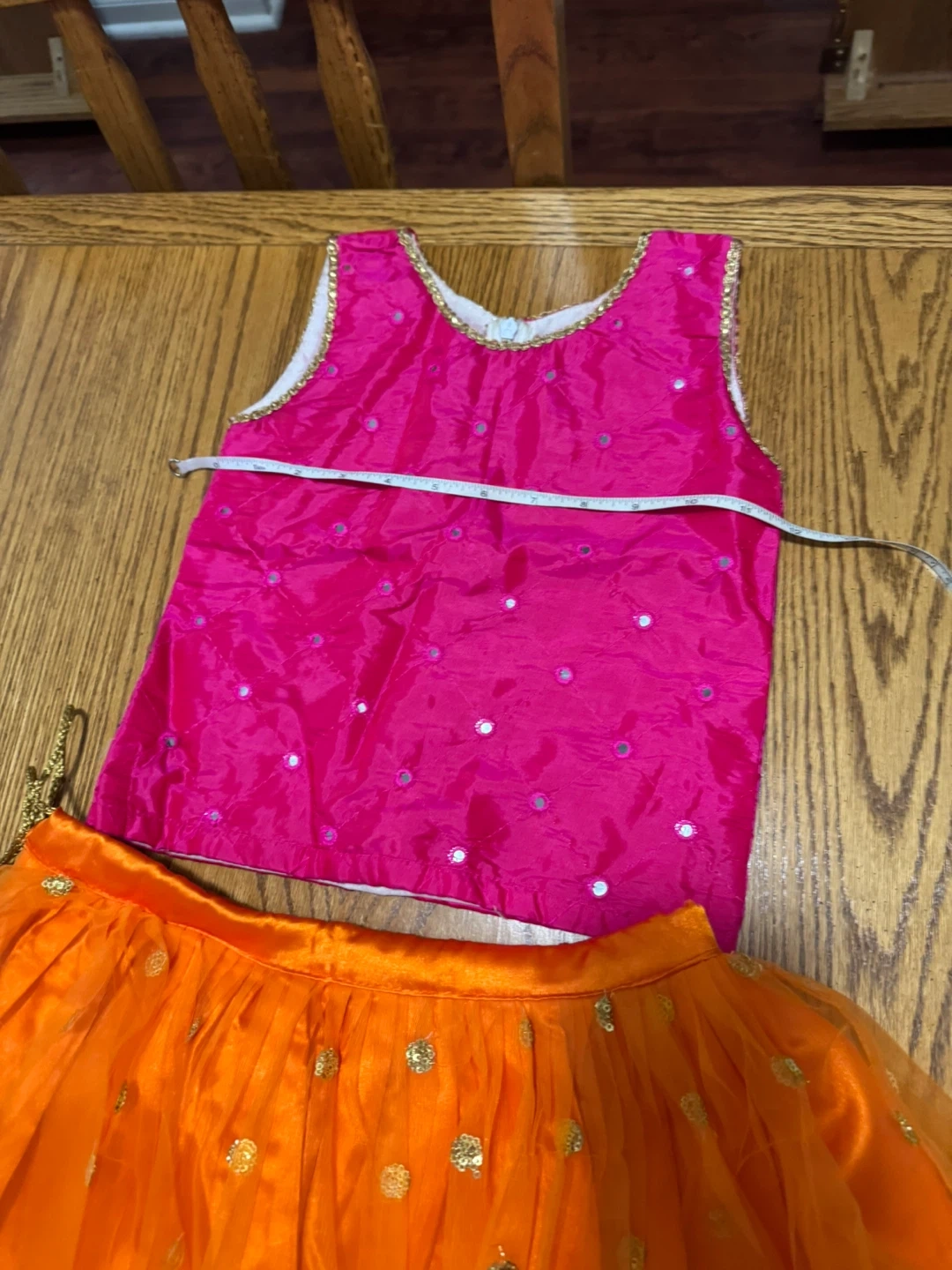 I'm selling a beautiful lehenga choli for girls, featuring a vibrant pink top and a bright orange skirt. It's perfect for parties or special occasions. The set is in great condition and ready for a new owner!