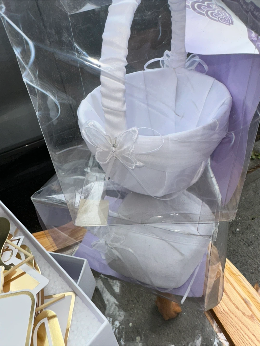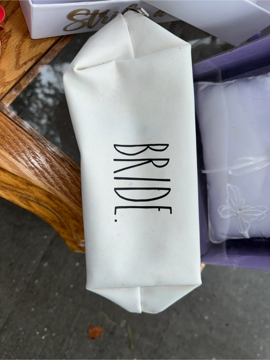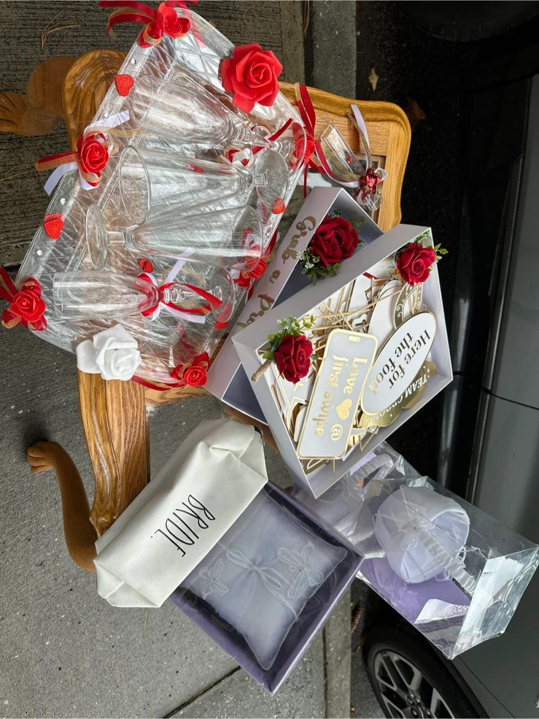 23Selling a set of wedding decorations! Includes a ring pillow, a 'BRIDE' pouch, photo booth props, and decorated champagne flutes. Perfect for adding a special touch to your big day
