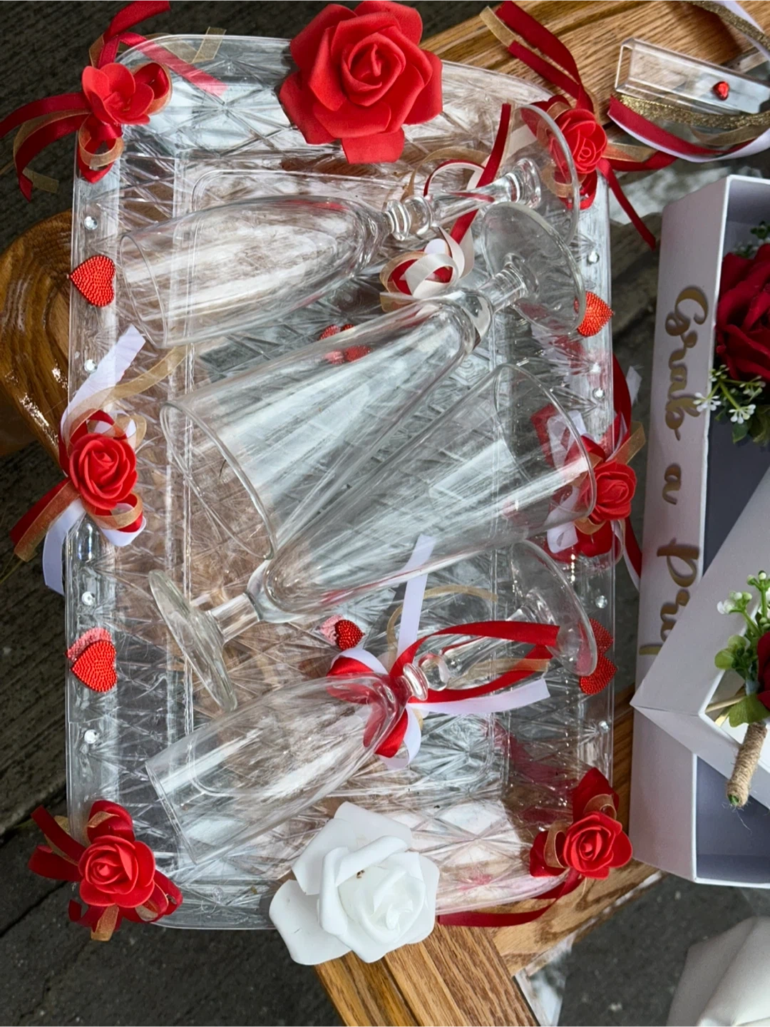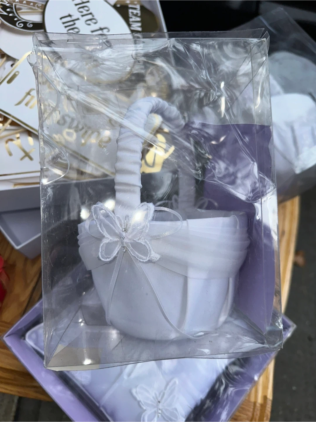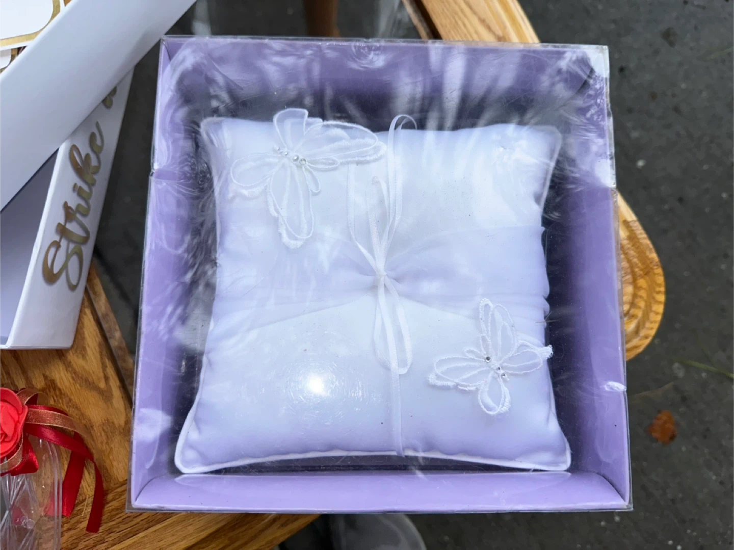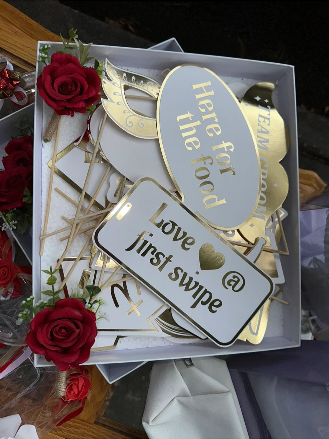 23Selling a set of wedding decorations! Includes a ring pillow, a 'BRIDE' pouch, photo booth props, and decorated champagne flutes. Perfect for adding a special touch to your big day