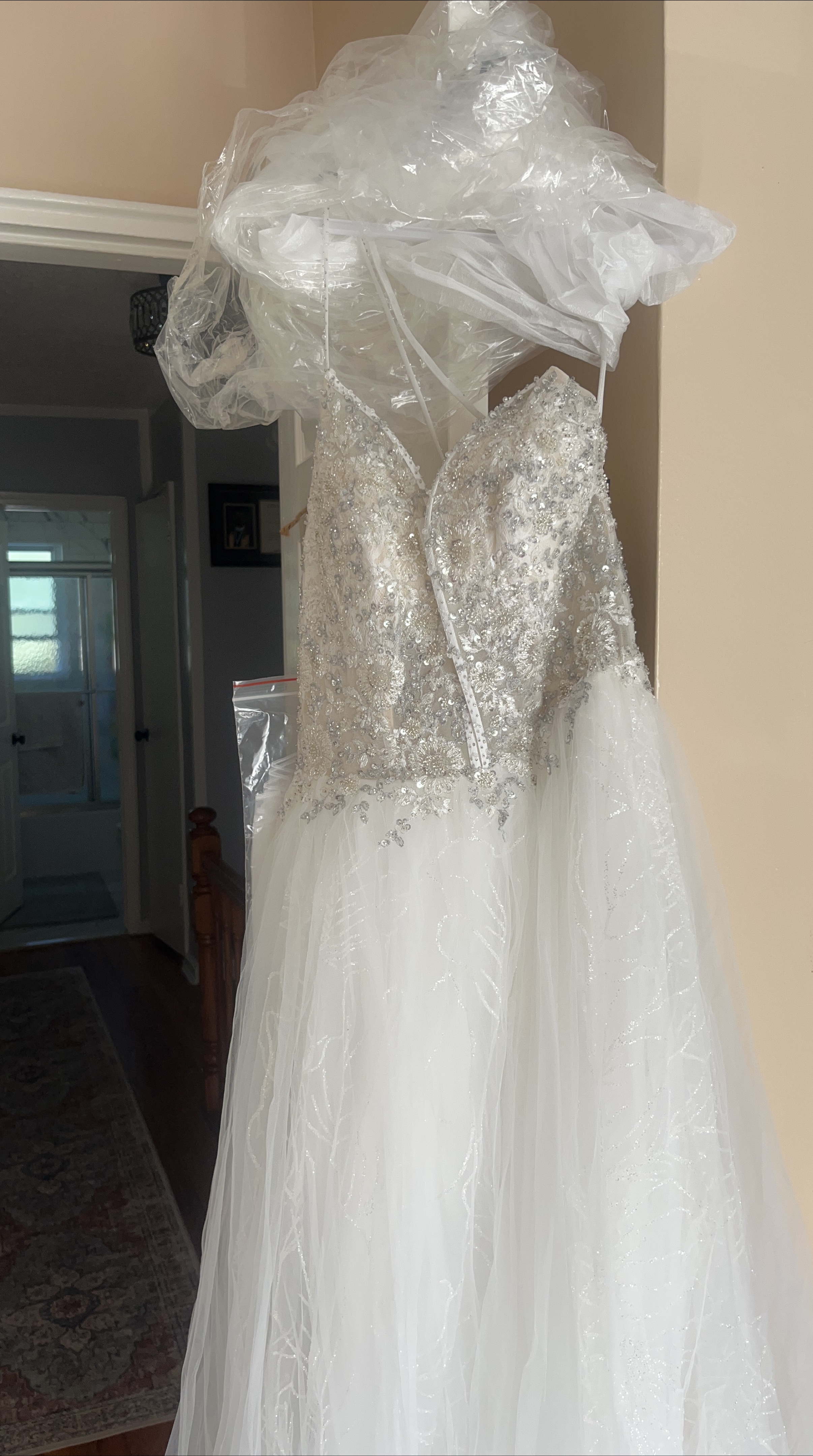 Selling a beautiful wedding dress. It's a stunning white gown with delicate beading on the bodice and a flowing skirt. Perfect for your special day!