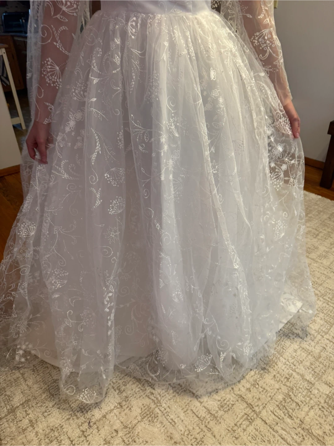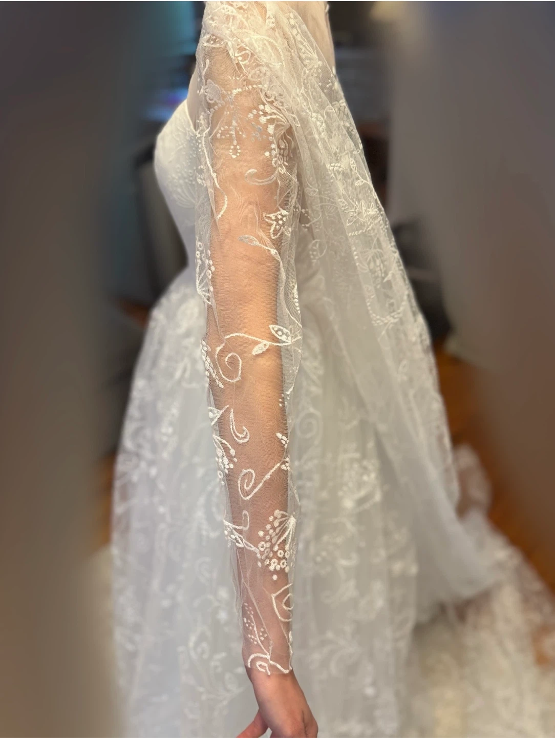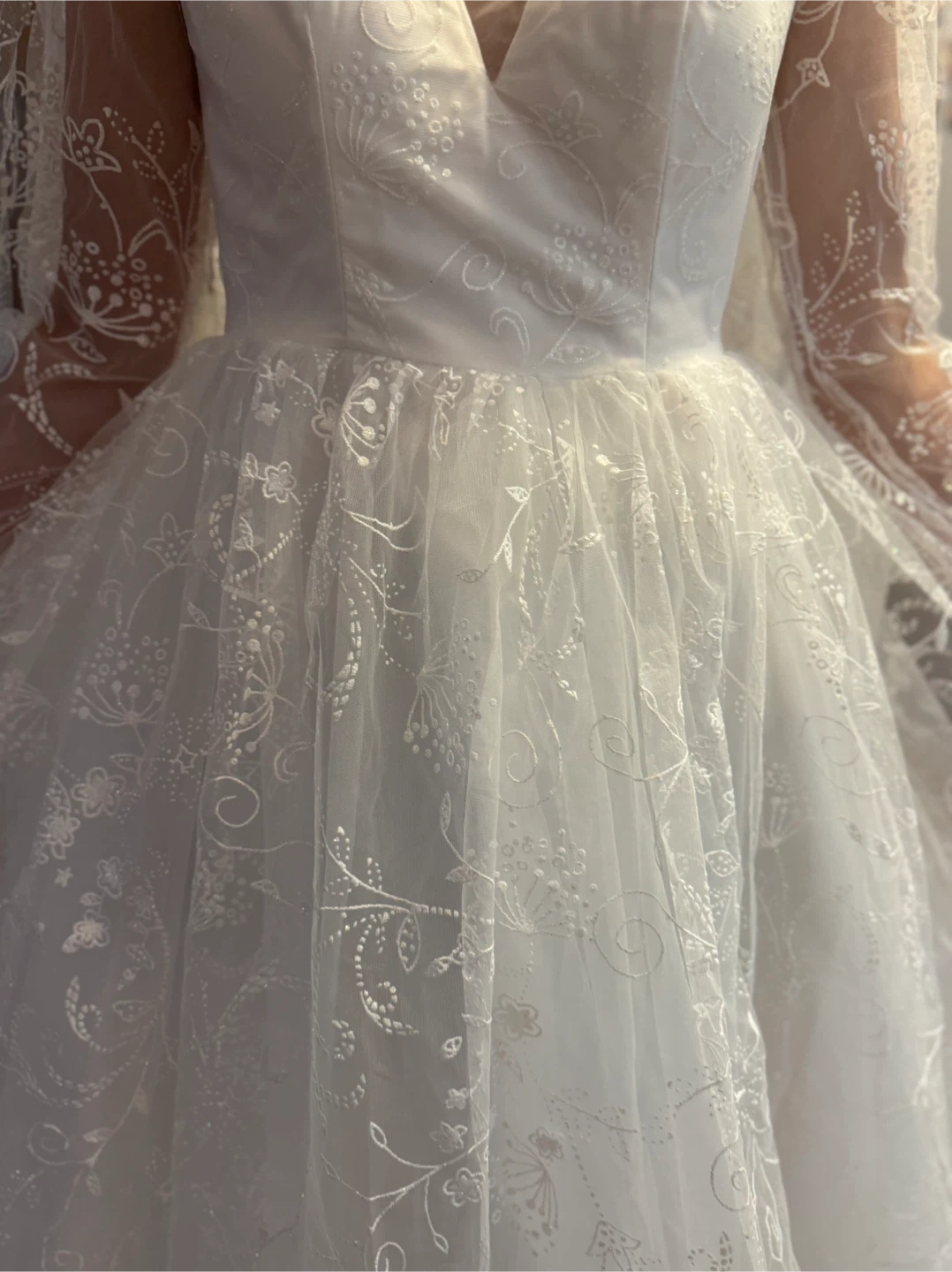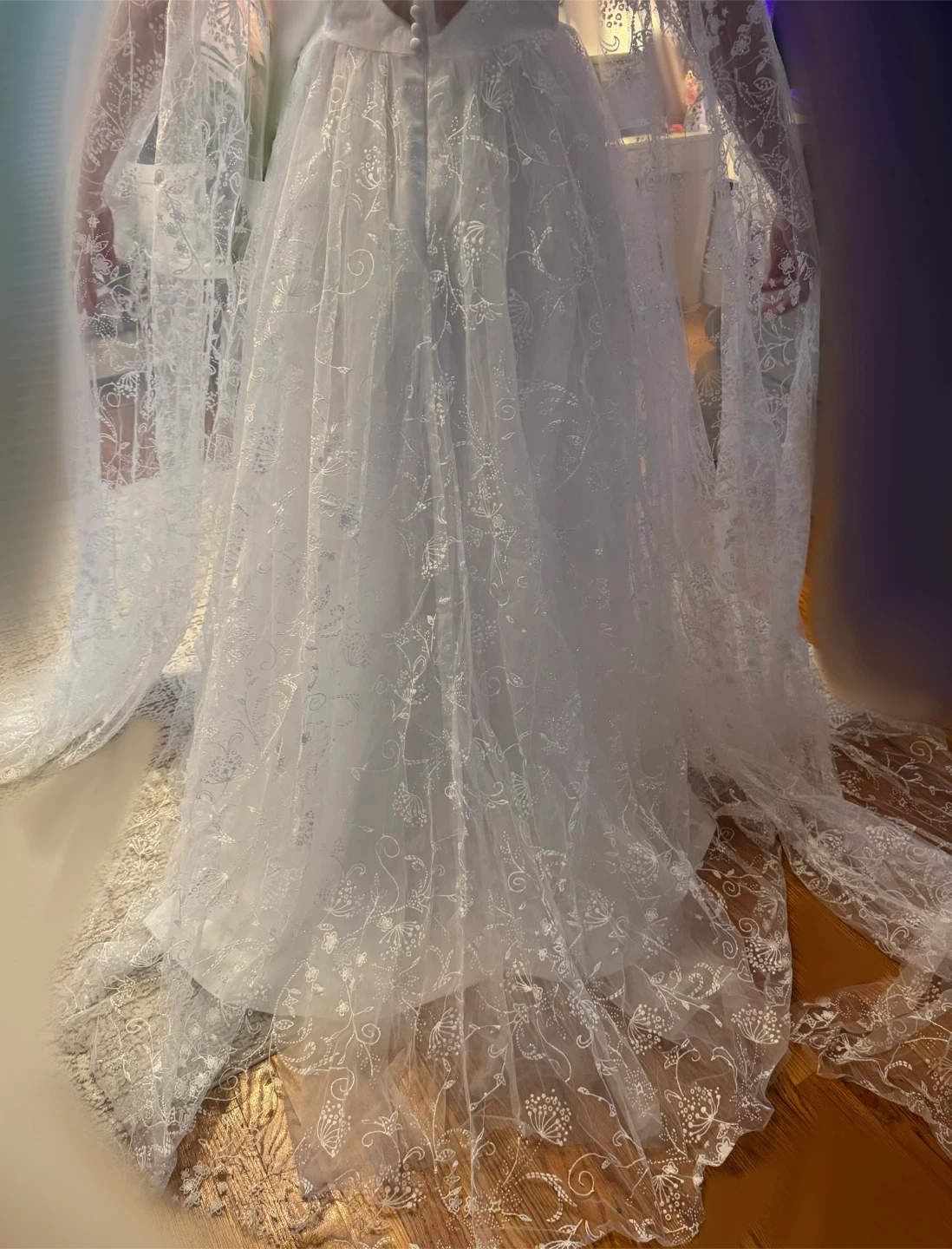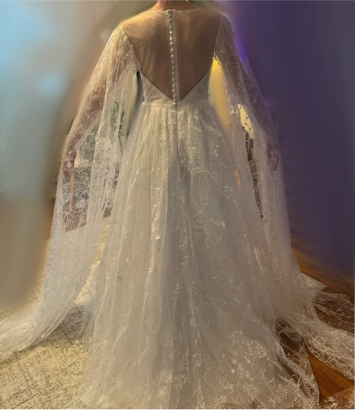 Beautiful white wedding dress featuring delicate floral embroidery throughout. It has long cape like sleeves perfect for your special day!
