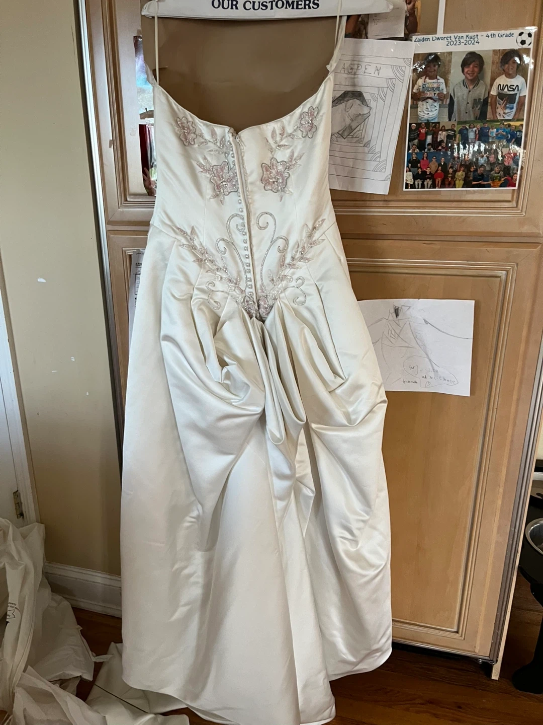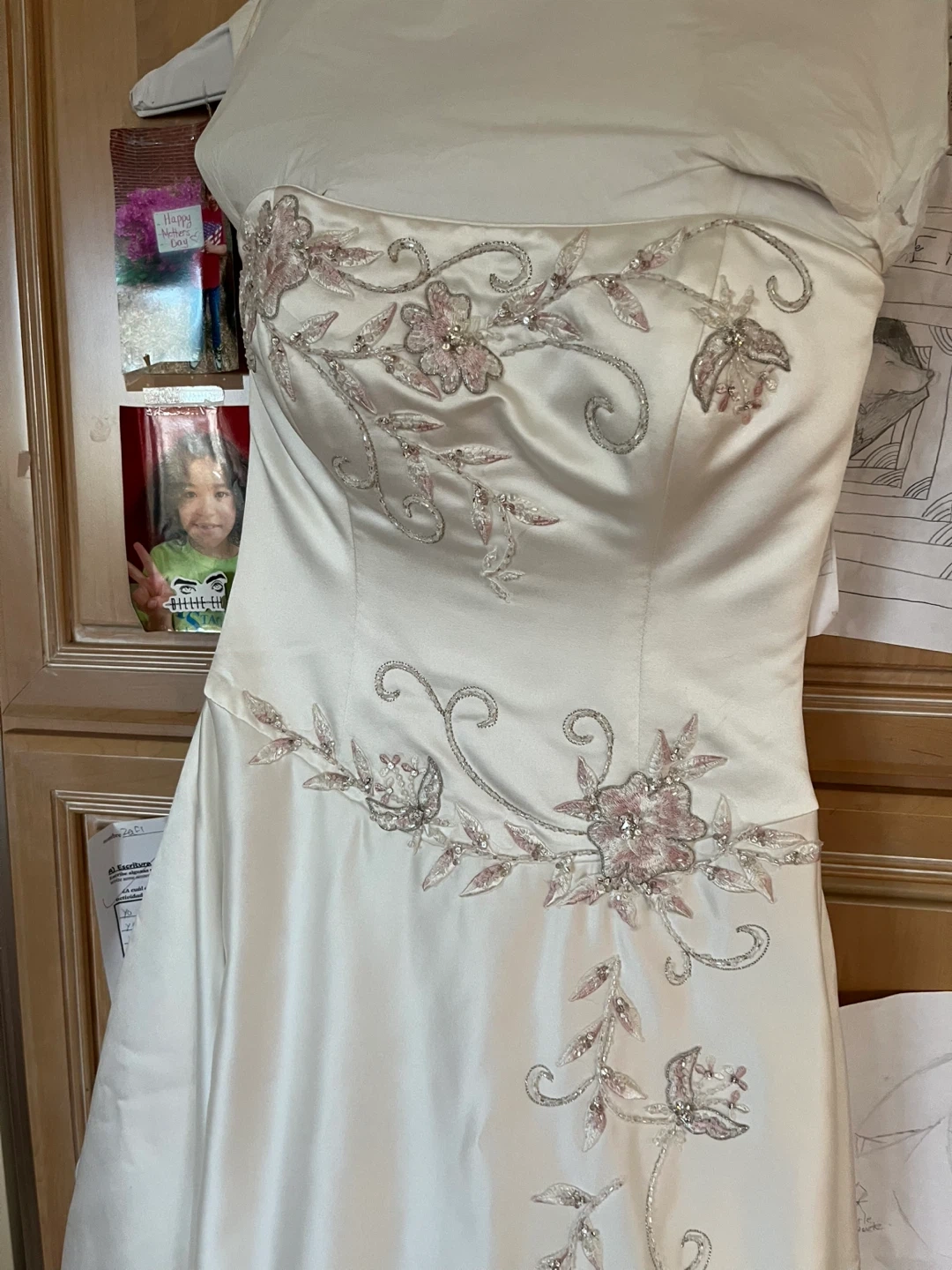 10Beautiful wedding dress with delicate floral embroidery. It features a strapless design and a flowing skirt. Perfect for your special day!