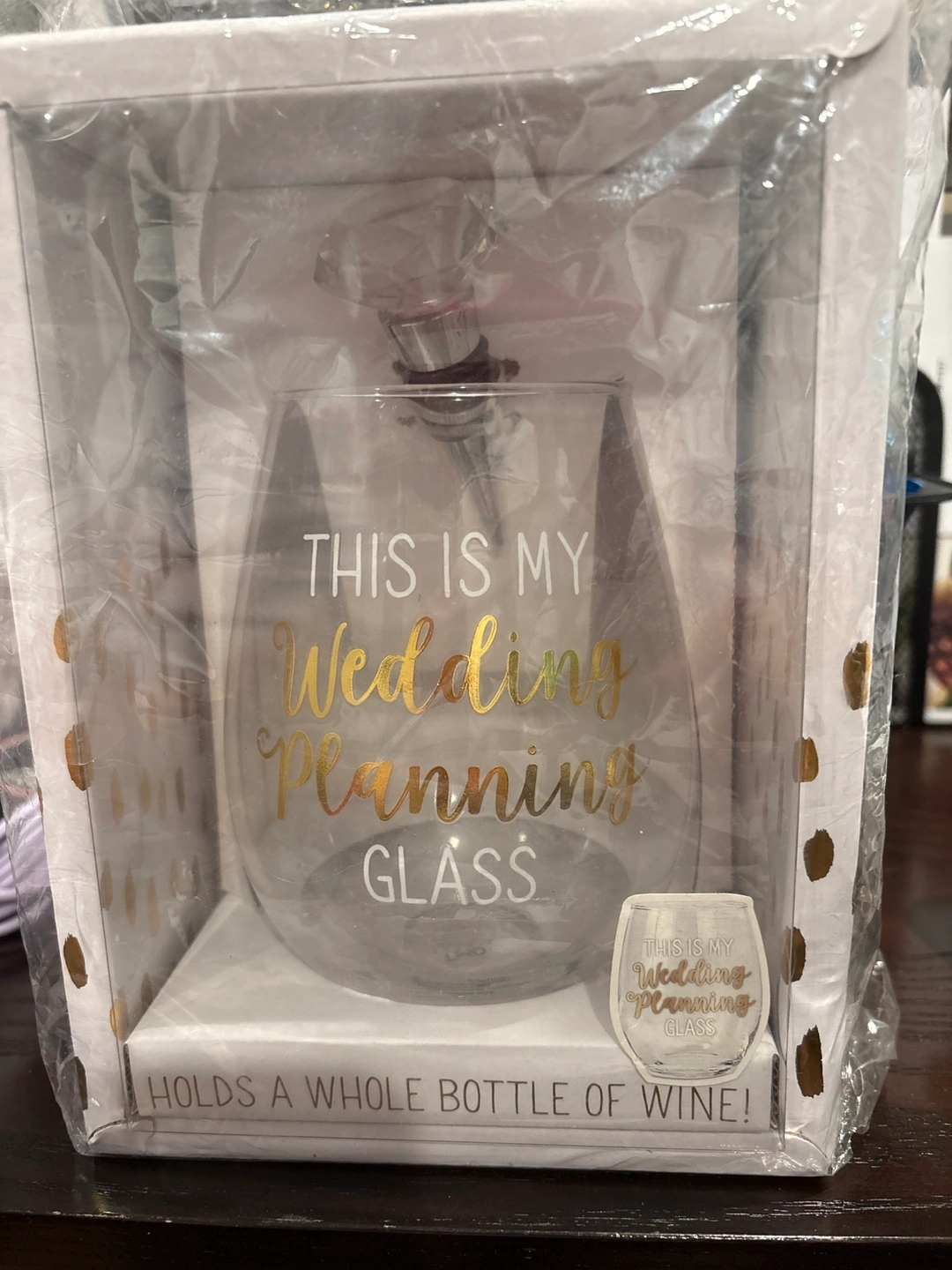 Large wine glass holds an entire bottle of wine. Features gold lettering and includes a stopper. Perfect for wedding planning.