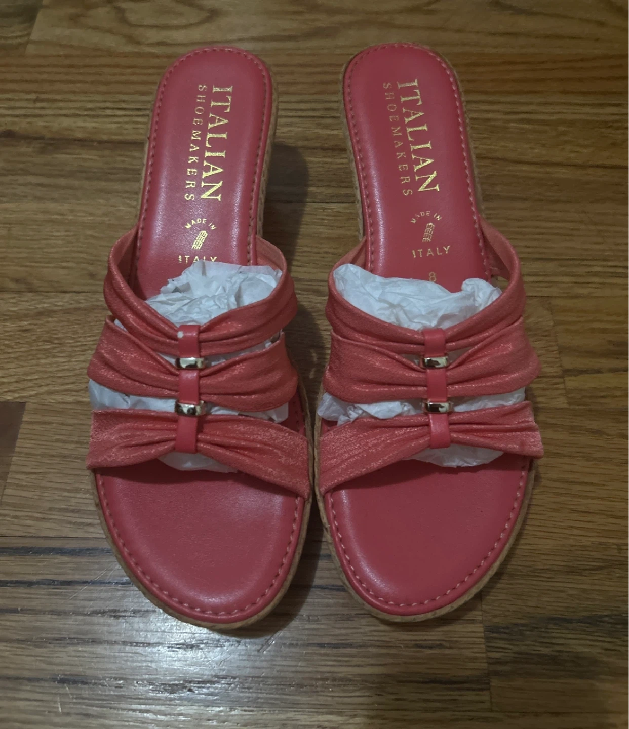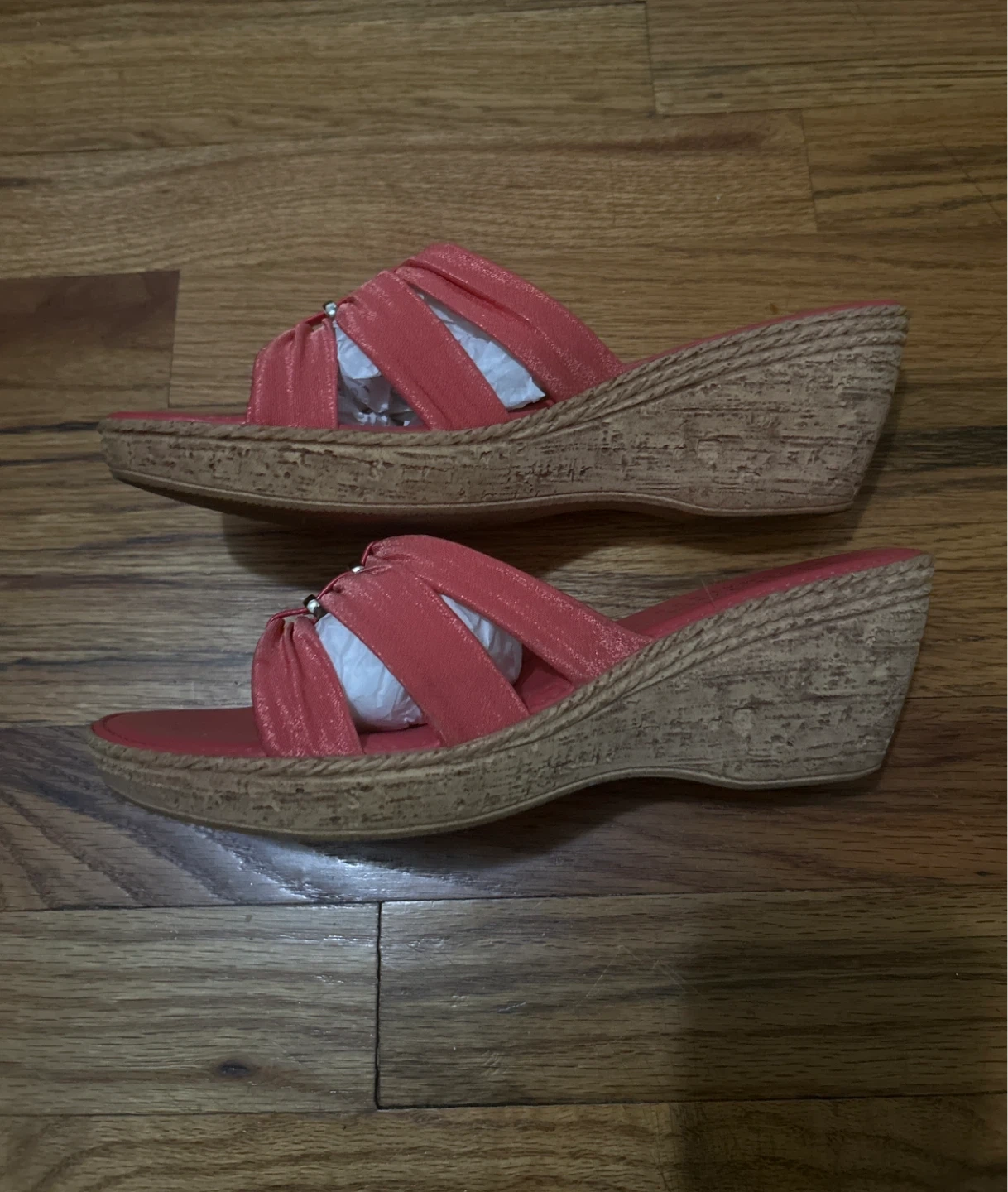 547Wedge sandals are in 8/10 condition besides maybe 1 scratch (you’ll see the white dot in pic 1). They're a beautiful coral color and a size 8. Comes with the original box!