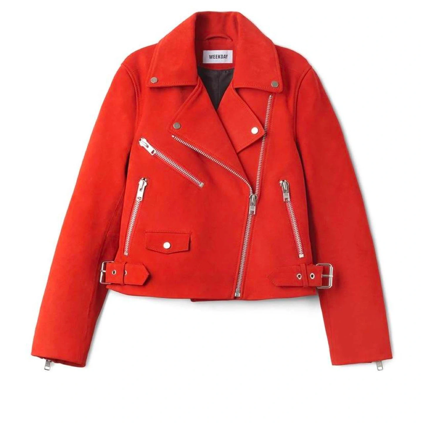 65Selling a vibrant red biker jacket from Weekday! It's a size 38. The jacket features a classic biker design with stylish zippers and detailing. Perfect for adding a pop of color to your wardrobe. Minor scratch, the rest like new