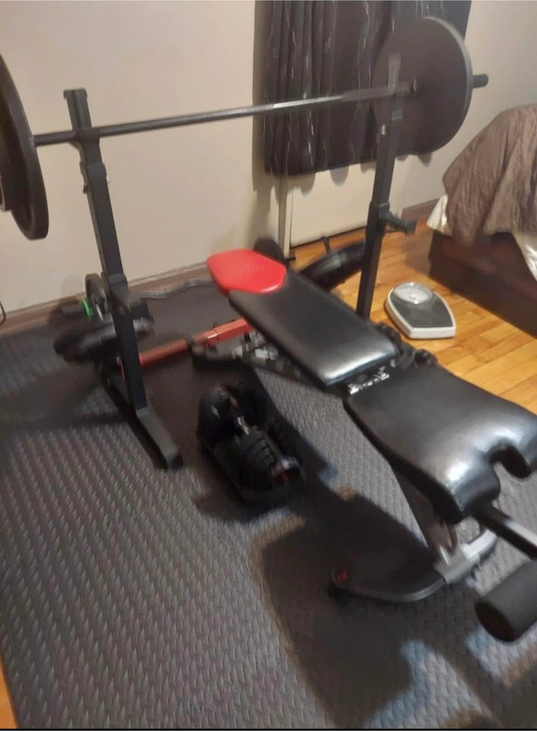 65Weight bench with barbell. Great for home workouts! Rack. Plates. Curl bar. Give me your best price. Stuff is moving fast. 130 pds of plates