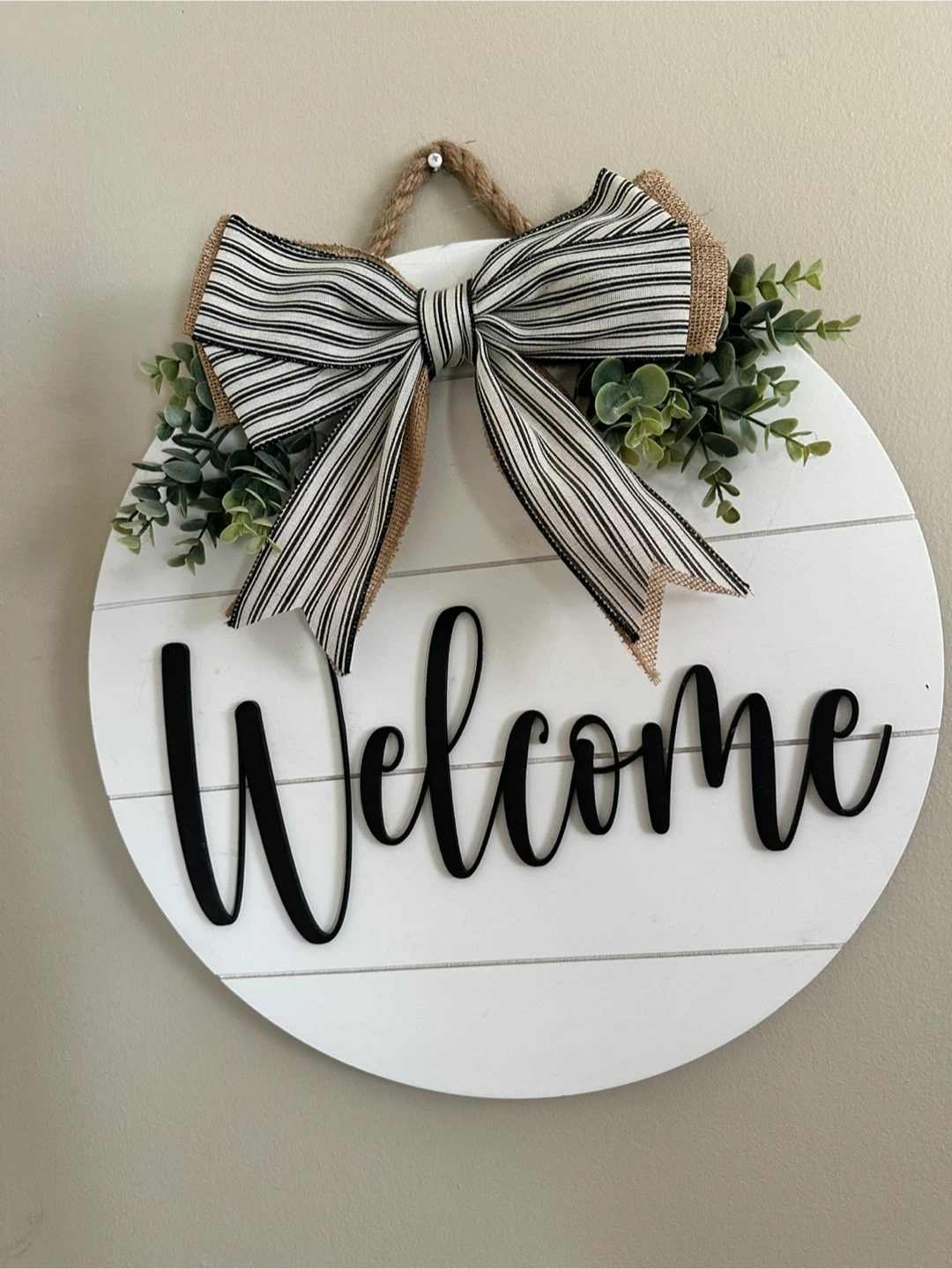 I'm selling a cute welcome door hanger! It features a stylish striped bow and some greenery. Perfect for adding a touch of warmth to your entryway