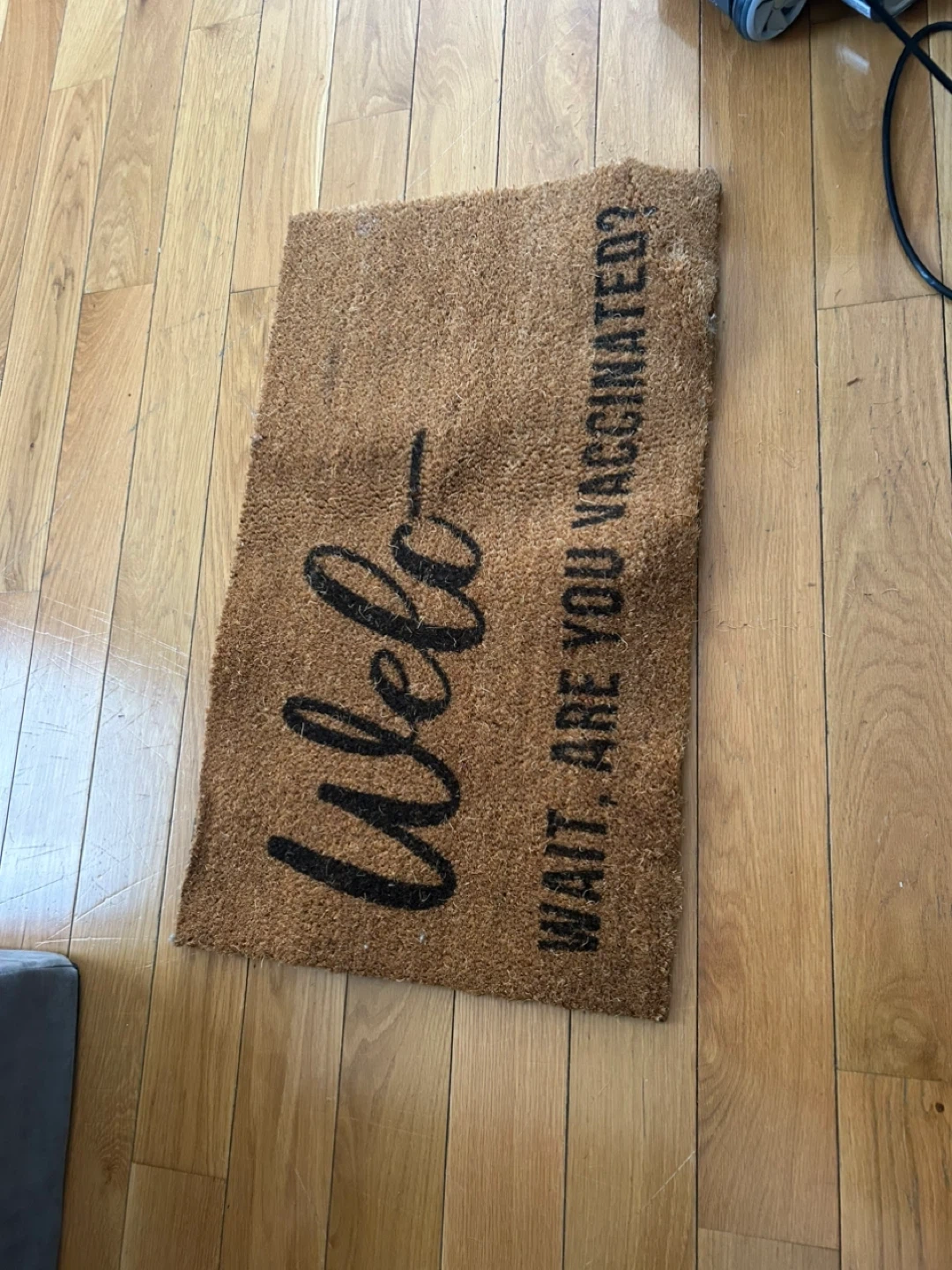 A fun welcome mat for your home! It reads 'Welcome' in cursive and also says 'Wait, Are You Vaccinated?'
