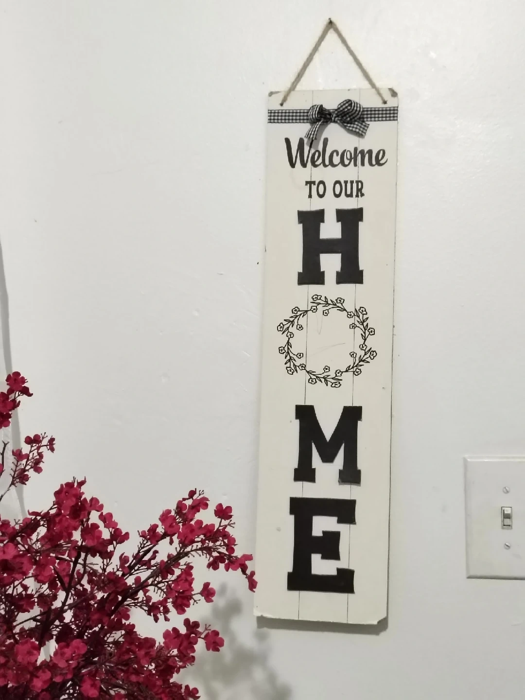 53(๐ฅ I am In) A cute "Welcome To Our Home" sign to hang in your entryway or anywhere you want to add a welcoming touch! The sign is in great condition and features a charming design with a black and white gingham bow at the top