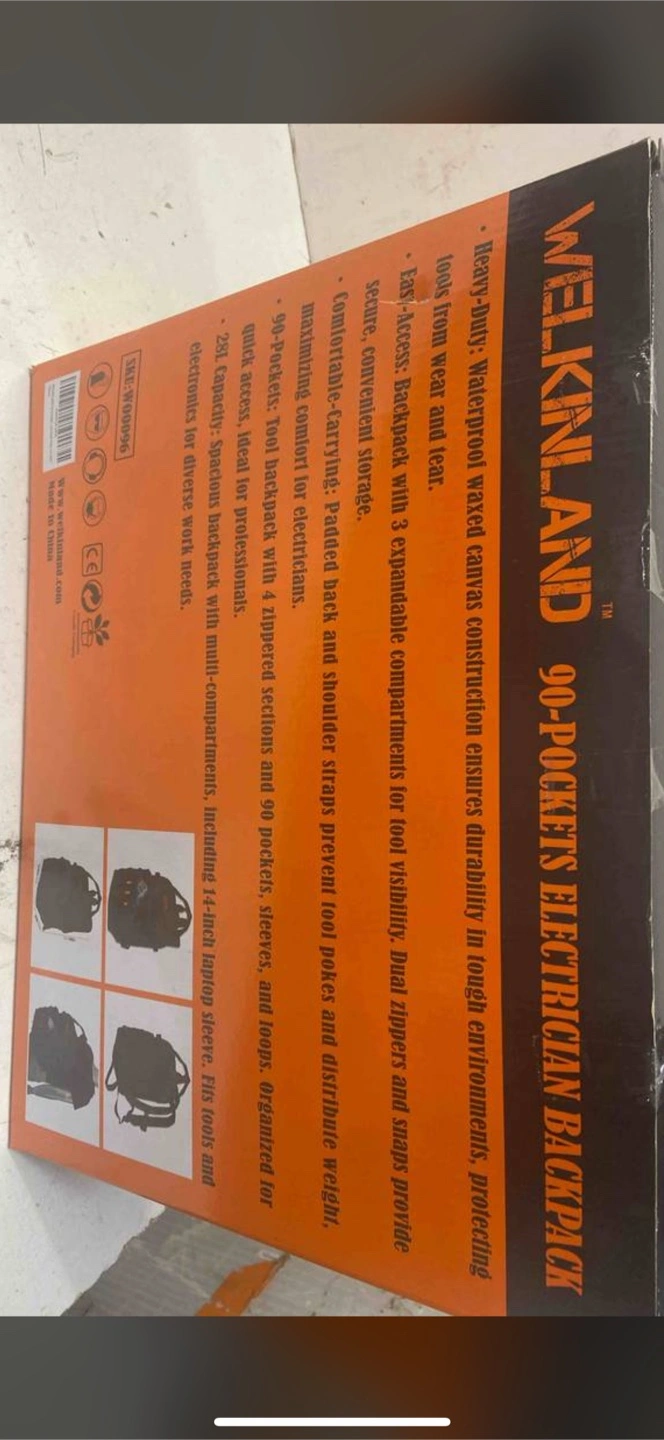 Selling a WELKINLAND 90-Pockets Electrician Backpack! This heavy-duty, waterproof, waxed canvas construction ensures durability in tough environments, protecting tools from wear and tear. It features easy-access backpack with 3 expandable compartments for tool visibility. Dual zippers and snaps provide secure, convenient storage. Comfortable-carrying, padded back and shoulder straps prevent tool pokes and distribute weight, maximizing comfort for electricians. It has 90-pockets tool backpack with a zippered section and 90 pockets, sleeves, and loops, organized for quick access. Ideal for professionals. It has a 28L Capacity-Spacious backpack with multi-compartments, including 14-inch laptop sleeve, fits tools and electronics for diverse work needs. The box is included