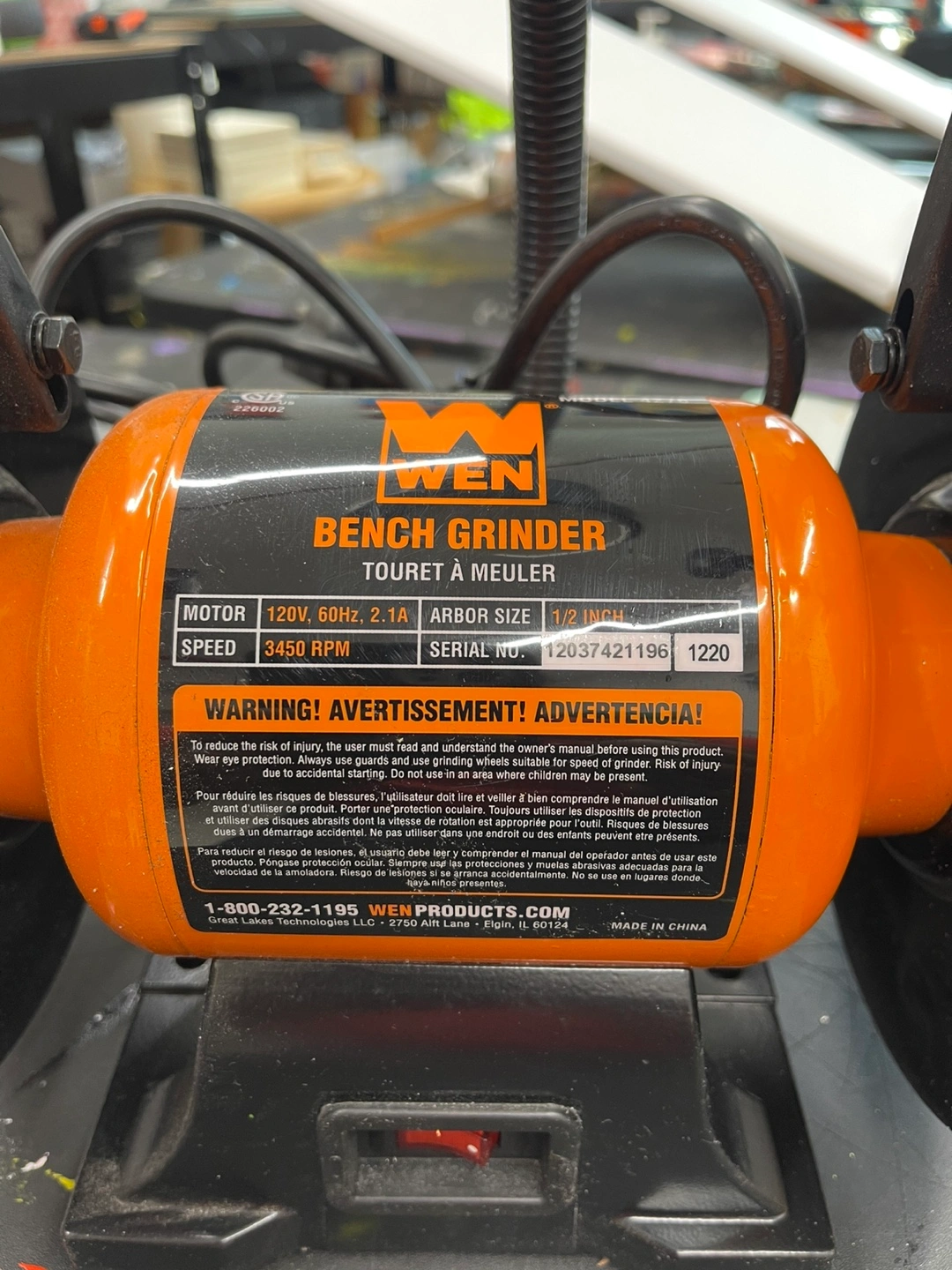 273Selling a WEN Bench Grinder, model 4276. It has a work light for better visibility. Runs on 120V, 60Hz, and 2.1A. The arbor size is 1/2 inch and the speed is 3450 RPM. Great for your workshop!