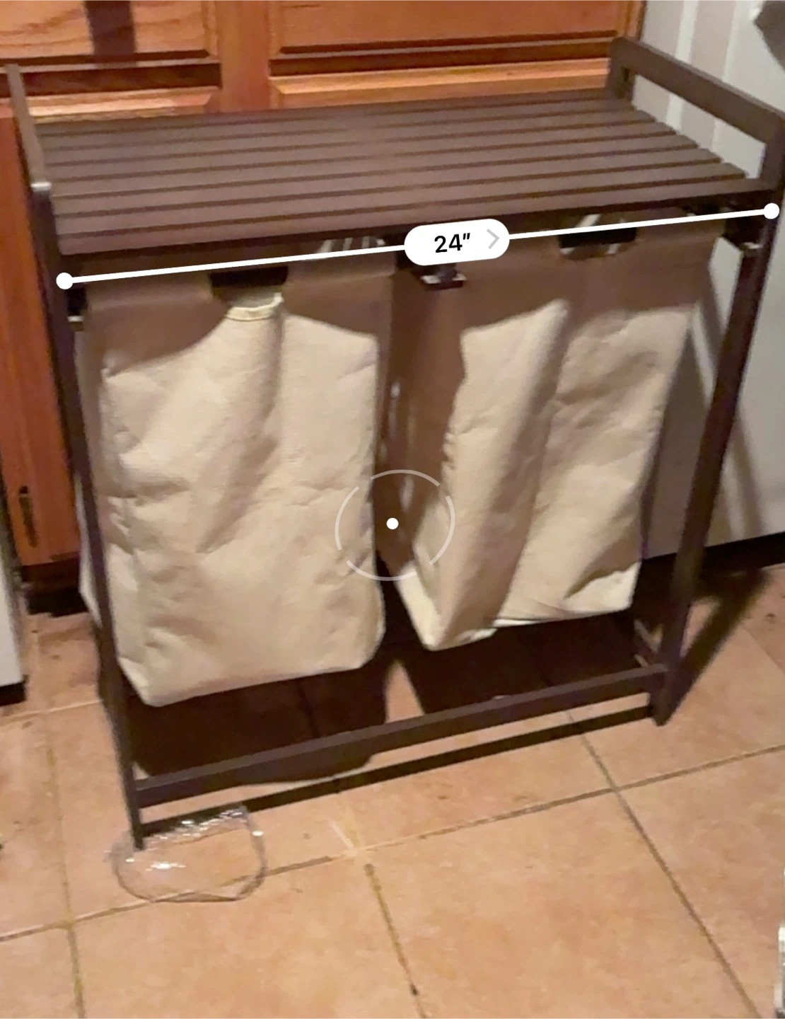 Selling a laundry hamper with a shelf on top! It features two cloth bags for sorting your laundry. The unit is 24 inches wide