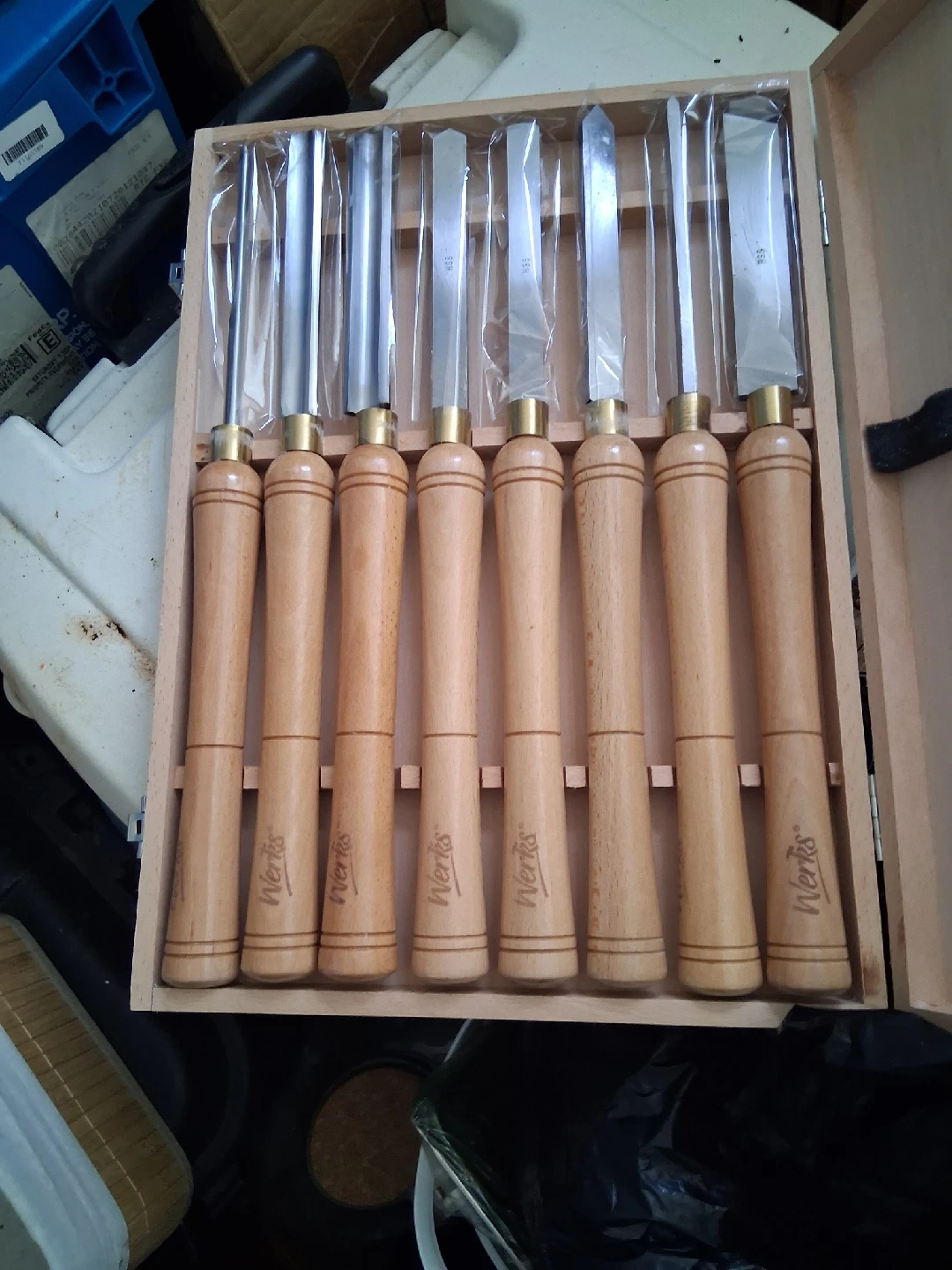 15I'm selling a Werks wood carving chisel set. It comes with a wooden box to keep them organized and protected. Each chisel has a wooden handle and a sharp metal blade. Great for woodworking projects!