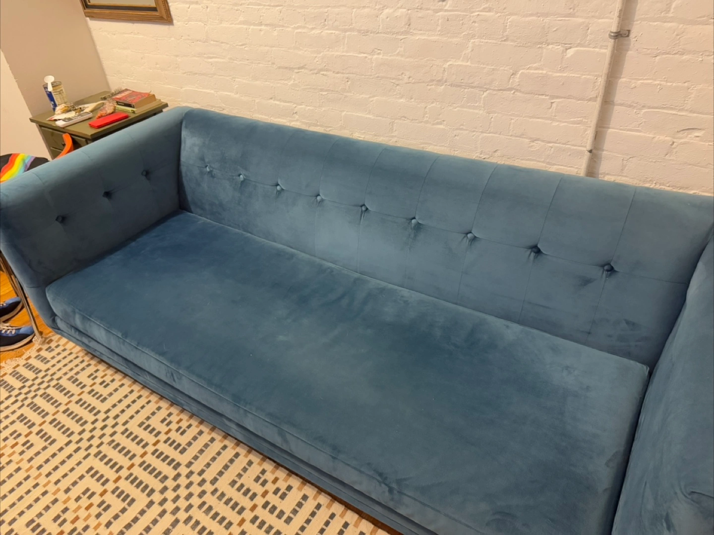 Selling a blue velvet sofa from West Elm. It's a comfortable and elegant piece that would look great in any living room. Good sturdy wooden legs, and great for napping on its soft velvety fabric. Barely used at all. Originally bought for $1,700, now selling for $600. (I can have it delivered and installed for $100 to any location)