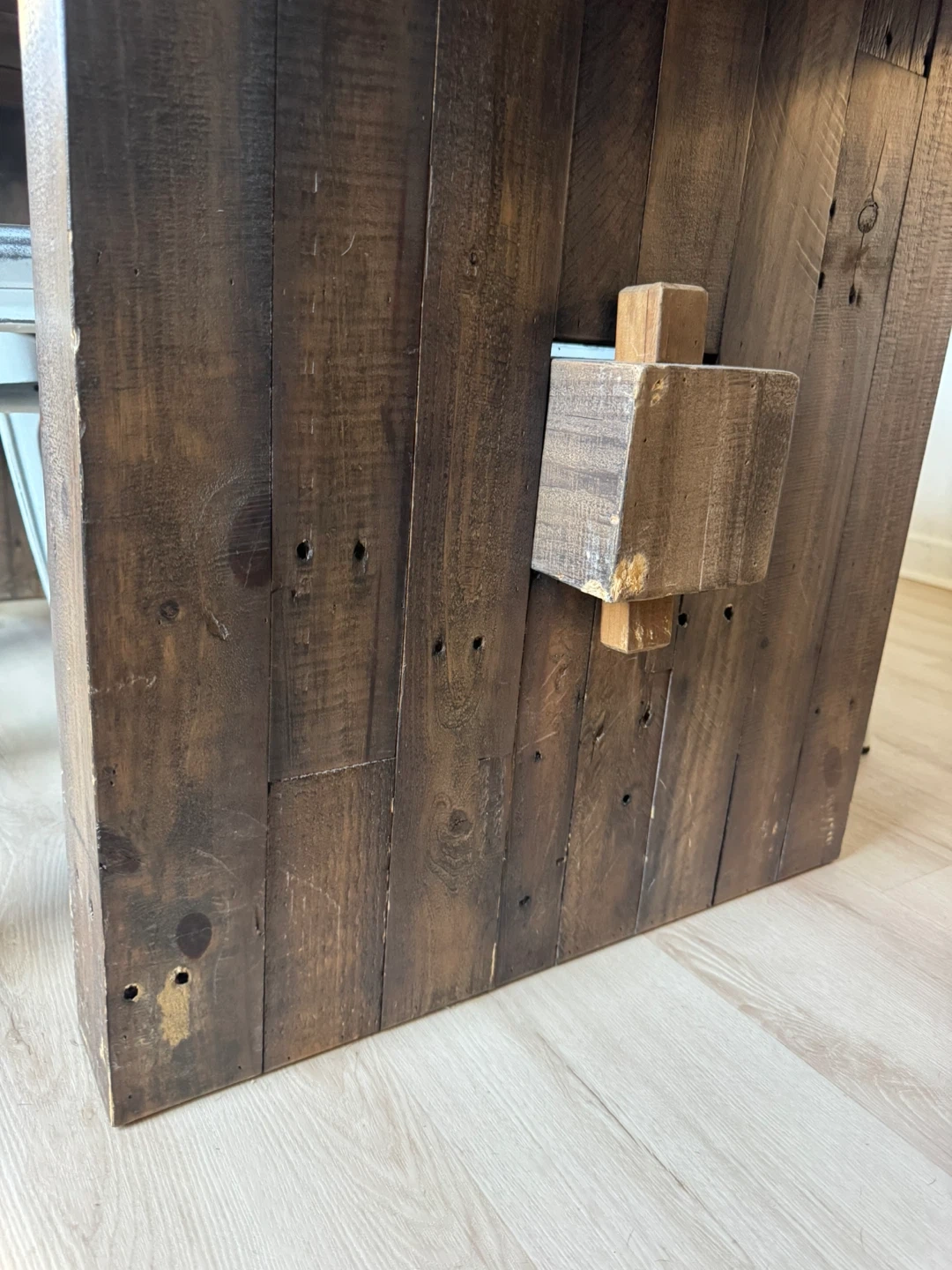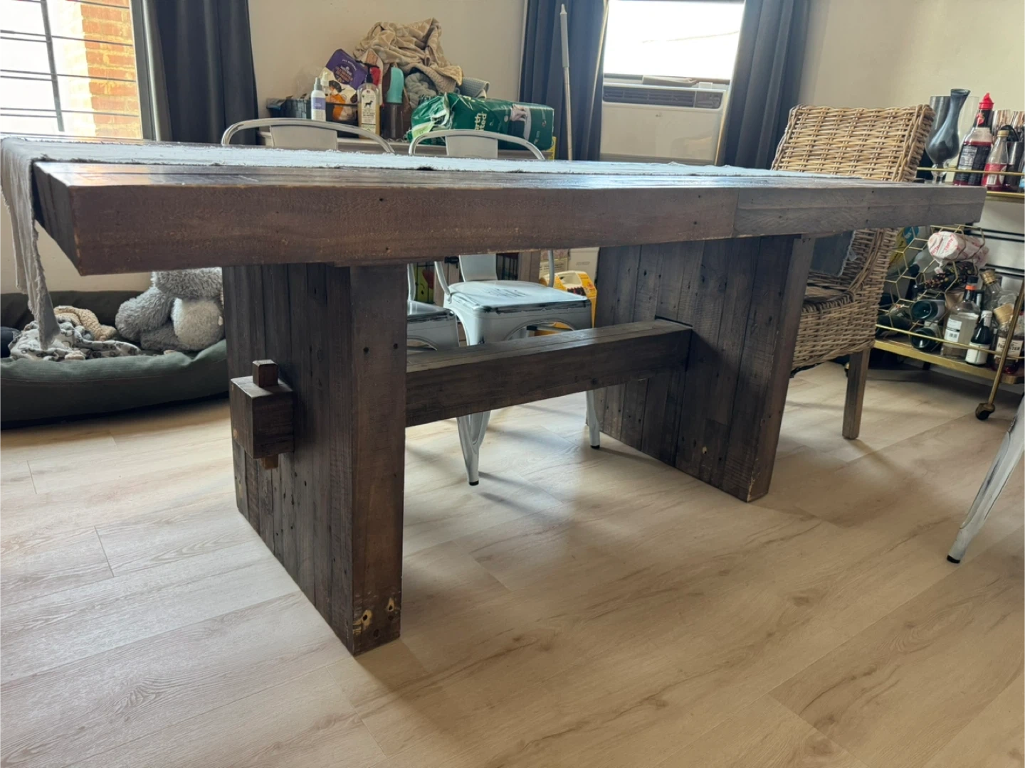 10Selling a rustic wooden dining table. It's a sturdy piece with a unique, weathered look that would be great for any dining room. The table has a solid wood construction with a visible wood grain and a naturally aged appearance. There are some signs of wear, which add to its rustic charm!