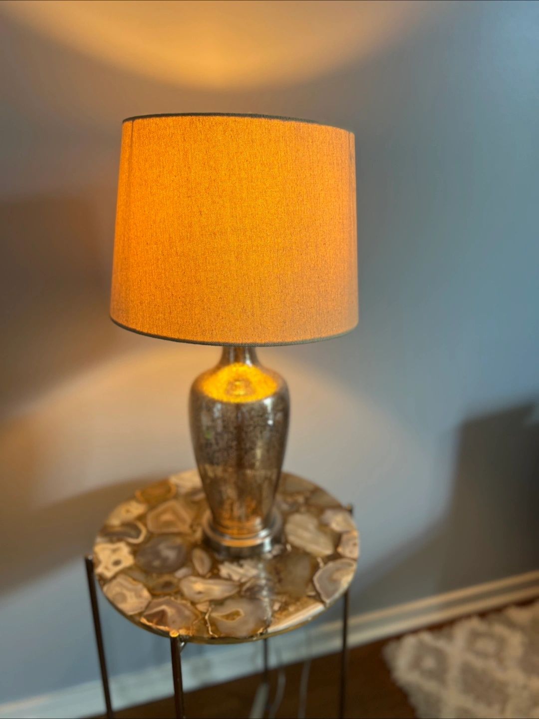 Selling a unique table lamp from West Elm, It features a glass colored base and a neutral-toned lampshade. The table attached to the lamp stand is made of agate stones. I can sell the lamp separately for $40 It's a beautiful and functional piece for any room. pick up only.